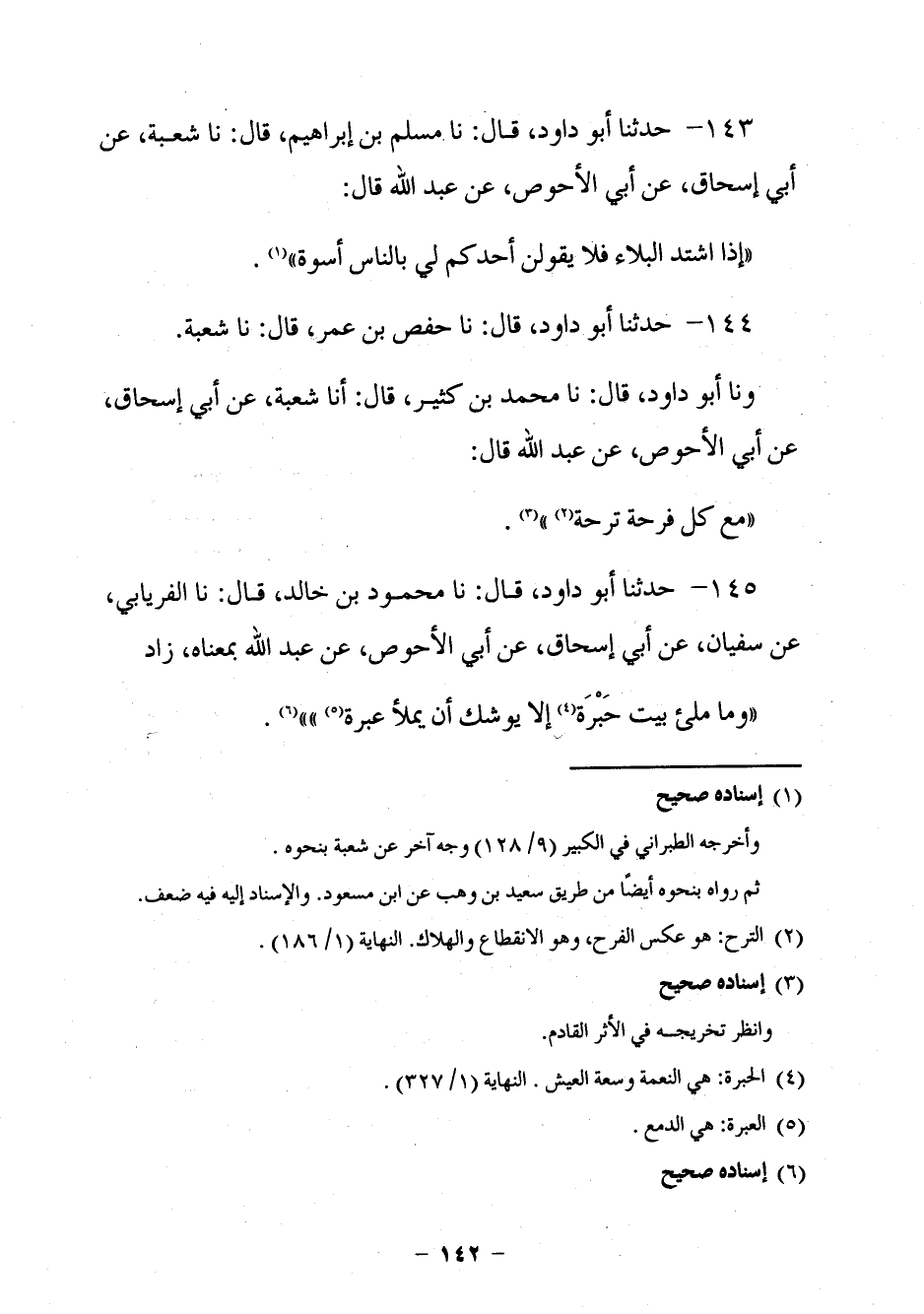 135 - حَدَّثَنَا أَبُو دَاوُدَ قَالَ: نا مُسْلِمُ بْنُ إِبْرَاهِيمَ، قَالَ: نا شُعْبَةُ، عَنْ أَبِي إِسْحَاقَ، عَنْ أَبِي الْأَحْوَصِ، عَنْ عَبْدِ اللَّهِ، قَالَ: §إِذَا اشْتَدَّ الْبَلَاءُ فَلَا يَقُولَنَّ أَحَدُكُمْ: لِي بِالنَّاسُ أُسْوَةٌ.
