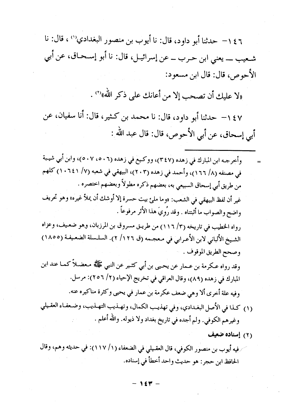 137 - حَدَّثَنَا أَبُو دَاوُدَ قَالَ: نا أَيُّوبُ بْنُ مَنْصُورٍ الْبَغْدَادِيُّ، قَالَ: نا شُعَيْبٌ يَعْنِي ابْنَ حَرْبٍ عَنْ إِسْرَائِيلَ، قَالَ: نا أَبُو إِسْحَاقَ، عَنْ أَبِي الْأَحْوَصِ، قَالَ: قَالَ ابْنُ مَسْعُودٍ: §لَا عَلَيْكَ أَنْ تَصْحَبَ إِلَّا مَنْ أَعَانَكَ عَلَى ذِكْرِ اللَّهِ.
