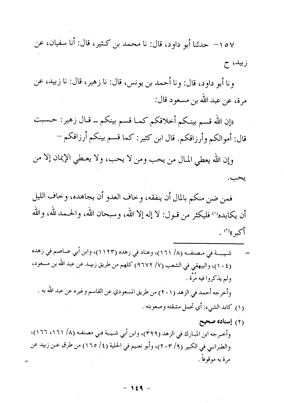 147 - حَدَّثَنَا أَبُو دَاوُدَ قَالَ: نا مُحَمَّدُ بْنُ كَثِيرٍ، قَالَ: أنا سُفْيَانُ، عَنْ زُبَيْدٍ. حَ. وَنَا أَبُو دَاوُدَ قَالَ: وَنا أَحْمَدُ بْنُ يُونُسَ، قَالَ: نا زُهَيْرٌ، قَالَ: نا زُبَيْدٌ، عَنْ مُرَّةَ، عَنْ عَبْدِ اللَّهِ بْنِ مَسْعُودٍ، قَالَ: §إِنَّ اللَّهَ قَسَمَ بَيْنَكُمْ أَخْلَاقَكُمْ كَمَا قَسَمَ بَيْنَكُمْ - قَالَ زُهَيْرٌ: حَسِبْتُ قَالَ: أَمْوَالَكُمْ وَأَرْزَاقَكُمْ. قَالَ ابْنُ كَثِيرٍ: كَمَا قَسَّمَ بَيْنَكُمْ أَرْزَاقَكُمْ - وَإِنَّ اللَّهَ يُعْطِي الْمَالَ مَنْ يُحِبُّ وَمَنْ لَا يُحِبُّ، وَلَا يُعْطِي الْإِيمَانَ إِلَّا مَنْ يُحِبُّ. فَمَنْ ضَنَّ مِنْكُمْ بِالْمَالِ أَنْ يُنْفِقَهُ، وَخَافَ الْعَدُوَّ أَنْ يُجَاهِدَهُ، وَخَافَ اللَّيْلَ أَنْ يُكَابِدَهُ فَلْيُكْثِرْ مِنْ قَوْلِ: لَا إِلَهَ إِلَّا اللَّهُ، وَسُبْحَانَ اللَّهُ، وَالْحَمْدُ لِلَّهِ، وَاللَّهُ أَكْبَرُ.