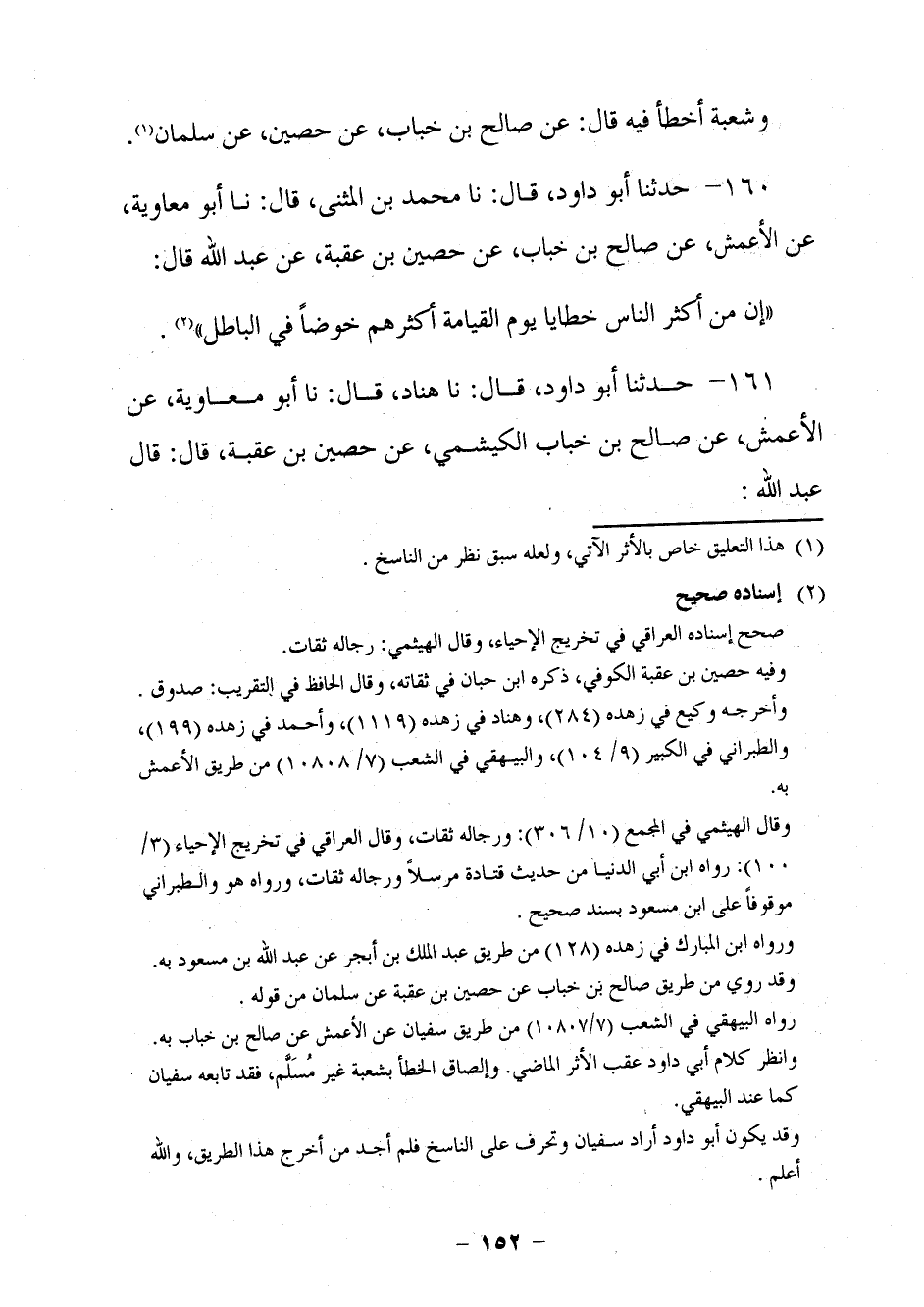 150 - حَدَّثَنَا أَبُو دَاوُدَ قَالَ: حَدَّثَنَا مُحَمَّدُ بْنُ الْمُثَنَّى، قَالَ: نَا أَبُو مُعَاوِيَةَ، عَنِ الْأَعْمَشِ، عَنْ صَالِحِ بْنِ خَبَّابٍ، عَنْ حُصَيْنِ بْنِ عُقْبَةَ، عَنْ عَبْدِ اللَّهِ، قَالَ: إِنَّ §مِنْ أَكْثَرِ النَّاسِ خَطَايَا يَوْمَ الْقِيَامَةِ أَكْثَرَهُمْ خَوْضًا فِي الْبَاطِلِ.