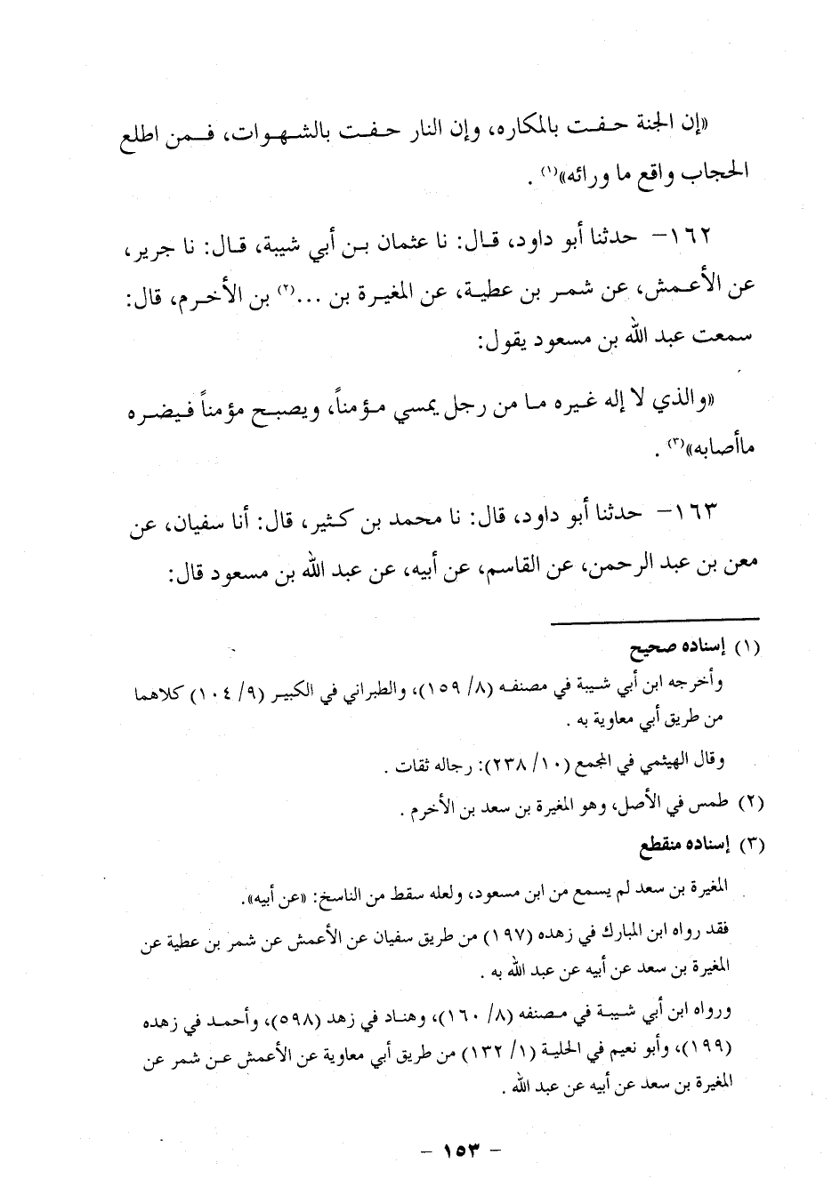 152 - حَدَّثَنَا أَبُو دَاوُدَ قَالَ: نا عُثْمَانُ بْنُ أَبِي شَيْبَةَ، قَالَ: نا جَرِيرٌ، عَنِ الْأَعْمَشِ، عَنْ شِمْرِ بْنِ عَطِيَّةَ، عَنِ الْمُغِيرَةِ بْنِ سَعْدِ بْنِ الْأَخْرَمِ قَالَ: سَمِعْتُ عَبْدَ اللَّهِ بْنَ مَسْعُودٍ، يَقُولُ: وَالَّذِي لَا إِلَهَ غَيْرُهُ §مَا مِنْ رَجُلٍ يُمْسِي مُؤْمِنًا، وَيُصْبِحُ مُؤْمِنًا فَيَضُرُّهُ مَا أَصَابَهُ.