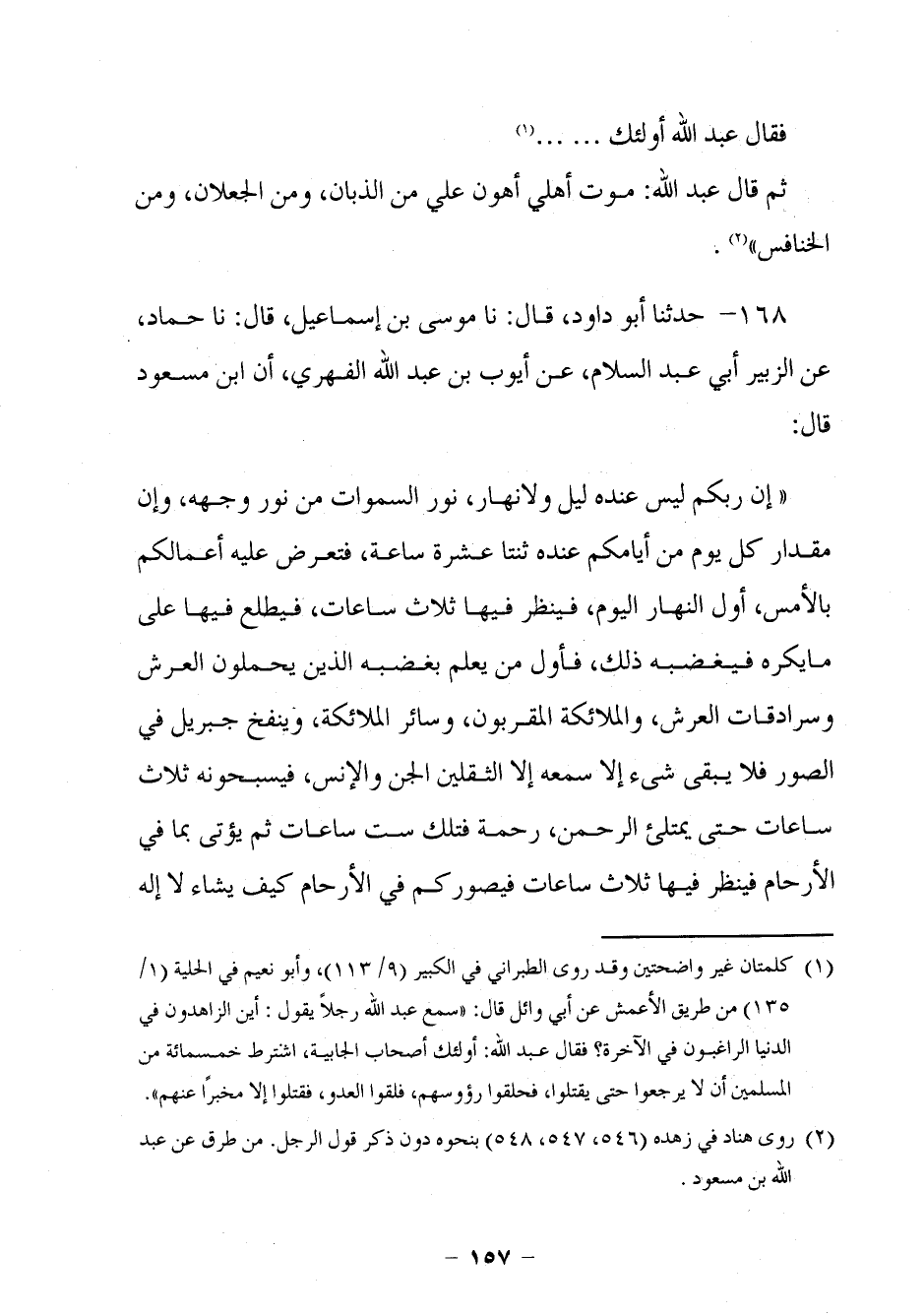 158 - حَدَّثَنَا أَبُو دَاوُدَ قَالَ: نا مُوسَى بْنُ إِسْمَاعِيلَ، قَالَ: نا حَمَّادٌ، عَنِ الزُّبَيْرِ أَبِي عَبْدِ السَّلَامِ، عَنْ أَيُّوبَ بْنِ عَبْدِ اللَّهِ الْفِهْرِيِّ، أَنَّ ابْنَ مَسْعُودٍ، قَالَ: إِنَّ §رَبَّكُمْ لَيْسَ عِنْدَهُ لَيْلٌ وَلَا نَهَارٌ، نَورُ السَّمَوَاتِ مِنْ نُورِ وَجْهِهِ، وَإِنَّ مِقْدَارَ كُلِّ يَوْمٍ مِنْ أَيَّامِكُمْ عِنْدَهُ ثِنْتَا عَشْرَةَ سَاعَةً، فَتُعْرَضُ عَلَيْهِ أَعْمَالُكُمْ بِالْأَمْسِ، أَوَّلَ النَّهَارِ الْيَوْمَ، فَيَنْظُرُ فِيهَا ثَلَاثَ سَاعَاتٍ، فَيَطَّلِعُ فِيهَا عَلَى مَا يَكْرَهُ فَيُغْضِبُهُ ذَلِكَ، فَأَوَّلُ مَنْ يَعْلَمُ بِغَضَبِهِ الَّذِينَ يَحْمِلُونَ الْعَرْشَ وَسُرَادِقَاتِ الْعَرْشِ، وَالْمَلَائِكَةُ الْمُقَرَّبُونَ، وَسَائِرُ الْمَلَائِكَةِ، وَيَنْفُخُ جِبْرِيلُ فِي الصُّوَرِ فَلَا يَبْقَى شَيْءٌ إِلَّا سَمِعَهُ إِلَّا الثَّقَلَيْنِ الْجِنُّ وَالْإِنْسُ، فَيُسَبِّحُونَهُ ثَلَاثَ سَاعَاتٍ حَتَّى يَمْتَلِئَ الرَّحْمَنُ رَحْمَةً , فَتِلْكَ سِتُّ سَاعَاتٍ , ثُمَّ يُؤْتَى بِمَا فِي الْأَرْحَامِ فَيَنْظُرُ فِيهَا ثَلَاثَ سَاعَاتٍ فَيُصَوِّرُكُمْ فِي الْأَرْحَامِ كَيْفَ يَشَاءُ لَا إِلَهَ -[158]- إِلَّا هُوَ الْعَزِيزُ الْحَكِيمُ، فَتِلْكَ تِسْعُ سَاعَاتٍ , ثُمَّ يَنْظُرُ فِي أَرْزَاقِ الْخَلْقِ كُلِّهِمْ ثَلَاثَ سَاعَاتٍ فَيَبْسُطُ الرِّزْقَ لِمَنْ يَشَاءُ وَيَقْدِرُ إِنَّهُ بِكُلِّ شَيْءٍ عَلِيمٌ، ثُمَّ قَالَ: {كُلَّ يَوْمٍ هُوَ فِي شَأْنٍ} [الرحمن: 29] قَالَ هَذَا مِنْ شَأْنِكُمْ وَشَأْنِ رَبِّكُمْ كُلَّ يَوْمٍ، فَذَلِكَ ثِنْتَا عَشْرَةَ سَاعَةً.