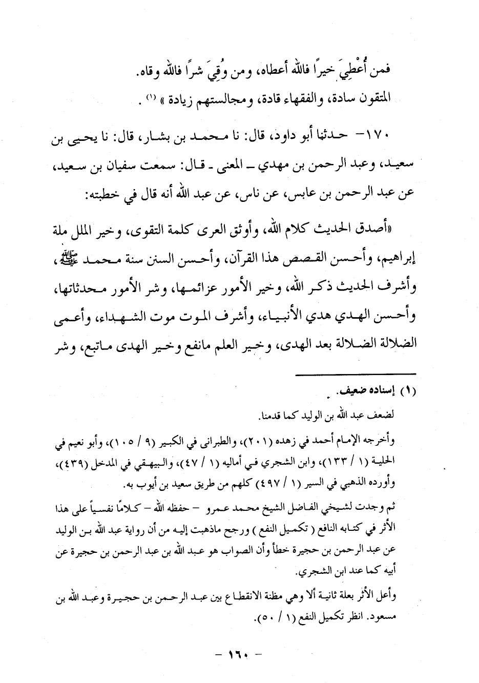160 - حَدَّثَنَا أَبُو دَاوُدَ قَالَ: نا مُحَمَّدُ بْنُ بَشَّارٍ، قَالَ: نا يَحْيَى بْنُ سَعِيدٍ، وَعَبْدُ الرَّحْمَنِ بْنُ مَهْدِيٍّ الْمَعْنَى قَالَ: سَمِعْتُ سُفْيَانَ بْنَ سَعِيدٍ، عَنْ عَبْدِ الرَّحْمَنِ بْنِ عَابِسٍ، عَنْ نَاسٍ، عَنْ عَبْدِ اللَّهِ، أَنَّهُ قَالَ فِي خُطْبَتِهِ: §أَصْدَقُ الْحَدِيثِ كَلَامُ اللَّهِ، وَأَوْثَقُ الْعُرَى كَلِمَةُ التَّقْوَى، وَخَيْرُ الْمِلَلِ مِلَّةُ إِبْرَاهِيمَ، وَأَحْسَنُ الْقَصَصِ هَذَا الْقُرْآنُ، وَأَحْسَنُ السُّنَنِ سُنَّةُ مُحَمَّدٍ صَلَّى اللَّهُ عَلَيْهِ وَسَلَّمَ، وَأَشْرَفُ الْحَدِيثِ ذِكْرُ اللَّهِ، وَخَيْرُ الْأُمُورِ عَزَائِمُهَا، وَشَرُّ الْأُمُورِ مُحْدَثَاتُهَا، وَأَحْسَنُ الْهَدْي هَدْي الْأَنْبِيَاءِ، وَأَشْرَفُ الْمَوْتِ مَوْتُ الشُّهَدَاءِ، وَأَعْمَى الضَّلَالَةِ الضَّلَالَةُ بَعْدَ الْهُدَى، وَخَيْرُ الْعِلْمِ مَا نَفَعَ , وَخَيْرُ الْهَدْي مَا تُبِعَ، وَشَرُّ -[161]- الْعَمَى عَمَى الْقَلْبِ، وَالْيَدُ الْعُلْيَا خَيْرٌ مِنَ الْيَدِ السُّفْلَى، وَمَا قَلَّ وَكَفَى خَيْرٌ مِمَّا كَثُرَ وَأَلْهَى، نَفْسٌ تُنْجِيهَا خَيْرٌ مِنْ إِمَارَةٍ لَا تُحْصِيهَا، وَشَرُّ الْعُزْلَةِ عِنْدَ حَضْرَةِ الْمَوْتِ , وَشَرُّ النَّدَامَةِ نَدَامَةٌ يَوْمَ الْقِيَامَةِ. وَمِنَ النَّاسِ مَنْ لَا يَأْتِي الصَّلَاةَ إِلَّا دُبُرًا، وَمِنَ النَّاسِ مَنْ لَا يَذْكُرُ اللَّهَ إِلَّا مُهَاجِرًا، وَأَعْظَمُ الْخَطَايَا اللِّسَانُ الْكَذُوبُ، وَخَيْرُ الْغِنَى غِنَى النَّفْسِ، وَخَيْرُ الزَّادِ التَّقْوَى، وَرَأْسُ الْحِكْمَةِ مَخَافَةُ اللَّهِ، وَخَيْرُ مَا أُلْقِيَ فِي الْقَلْبِ الْيَقِينُ قَالَ عَنْ عَبْدِ الرَّحْمَنِ: التَقَاهُ كَانَ الْيَقِينُ. وَالرِّيَبُ كَذَا قَالَ ابْنُ بَشَّارٍ مِنَ الْكُفْرِ، وَالنَّوْحُ مِنْ عَمَلِ الْجَاهِلِيَّةِ، وَالْغُلُولُ مِنْ جَمْرِ جَهَنَّمَ، وَالْكَنْزُ كَيُّ مِنَ النَّارِ، وَالشِّعْرُ مَزَامِيرُ إِبْلِيسَ، وَالْخَمْرُ جِمَاعُ الْإِثْمِ، وَالنِّسَاءُ حَبَائِلُ الشَّيْطَانِ، وَالشَّبَابُ شُعْلَةٌ مِنَ الْجُنُونِ، وَشَرُّ الْمَكَاسِبِ كَسْبُ الرِّبَا، وَشَرُّ الْمَآكِلِ أَكْلُ مَالِ الْيَتِيمِ، وَالسَّعِيدُ مَنْ وَعِظَ بِغَيْرِهِ، وَالشَّقِيُّ مَنْ شَقِيَ فِي بَطْنِ أُمِّهِ، وَيَكْفِي أَحَدَكُمْ مَا قَنَعَتْ نَفْسُهُ، وَإِنَّمَا يَصِيرُ إِلَى مَوْضِعِ أَرْبَعَةِ أَذْرُعٍ , وَالْأُمُورُ بِآخِرِهَا , وَأَمْلَكُ الْعَمَلِ خَوَاتِمُهُ، وَشَرُّ الرَّوَايَا رَوَايَا الْكَذِبِ، وَكُلُّ مَا هُوَ آتٍ قَرِيبٌ، وَسِبَابُ الْمُسْلِمِ فُسُوقٌ، وَقِتَالُهُ كُفْرٌ، وَأَكْلُ لَحْمِهِ مِنْ مَعَاصِي اللَّهِ، وَحُرْمَةُ مَالِهِ كَحُرْمَةِ دَمِهِ، وَمَنْ يَتَأَلَّى عَلَى اللَّهِ يُكَذِّبْهُ، وَمَنْ يَغْفِرْ يَغْفِرِ اللَّهُ لَهُ، وَمَنْ يَعْفُ يَعْفُ اللَّهُ عَنْهُ، وَمَنْ يَكْظِمِ الْغَيْظَ يَأْجُرْهُ اللَّهُ، وَمَنْ يَصْبِرْ عَلَى الرَّزَايَا يَعْقُبْهُ اللَّهُ، وَمَنْ يَعْرِفِ الْبَلَاءَ يَصْبِرْ عَلَيْهِ، وَمَنْ لَا يَعْرِفْهُ يُنْكِرْهُ، وَمَنْ يَسْتَكْبِرْ يَضَعْهُ اللَّهُ، وَمَنْ يَبْتَغِ السُّمْعَةَ يُسَمِّعِ اللَّهُ بِهِ، وَمَنْ يَنْوِي الدُّنْيَا تُعْجِزْهُ وَقَالَ: عَنْ عَبْدِ الرَّحْمَنِ: يَعْجَزْ عَنْهَا -[162]- وَمَنْ يُطِعِ الشَّيْطَانَ يَعْصِ اللَّهَ، وَمَنْ يَعْصِ اللَّهَ يُعَذِّبْهُ. قَالَ فِي حَدِيثِ عَبْدِ الرَّحْمَنِ: أَصْدَقُ الْحَدِيثِ كِتَابُ اللَّهِ، وَأَوْثَقُ الْعُرْي كَلِمَةُ اللَّهِ. وَقَالَ: عَنْ عَبْدِ الرَّحْمَنِ قَالَ: نَا سُفْيَانُ قَالَ: عَنْ عَبْدِ الرَّحْمَنِ بْنِ عَابِسٍ قَالَ: حَدَّثَنِي نَاسٌ، عَنْ عَبْدِ اللَّهِ
