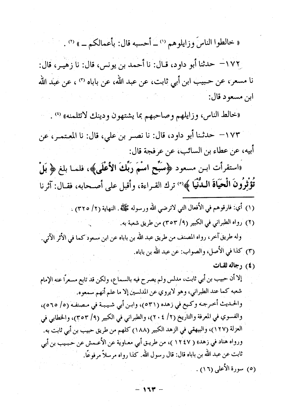 163 - حَدَّثَنَا أَبُو دَاوُدَ قَالَ: نا نَصْرُ بْنُ عَلِيٍّ، قَالَ: نا الْمُعْتَمِرُ، عَنْ أَبِيهِ، عَنْ عَطَاءِ بْنِ السَّائِبِ، عَنْ عَرْفَجَةَ، قَالَ: §اسْتَقْرَأْتُ ابْنَ مَسْعُودٍ: سَبِّحِ اسْمَ رَبِّكَ الْأَعْلَى، فَلَمَّا بَلَغَ {بَلْ تُؤْثِرُونَ الْحَيَاةَ الدُّنْيَا} [الأعلى: 16] تَرَكَ الْقِرَاءَةَ، وَأَقْبَلَ عَلَى أَصْحَابِهِ، فَقَالَ: آثَرْنَا -[164]- الْحَيَاةَ الدُّنْيَا عَلَى الْآخِرَةِ لِأَنَّا رَأَيْنَا زَهْرَتَهَا وَزِينَتَهَا وَطَعَامَهَا وَشَرَابَهَا، وَزُوِّيَتْ عَنَّا الْآخِرَةُ فَاخْتَرْنَا الْعَاجِلُ عَلَى الْآجِلِ وَقَرَأَ: (بَلْ يُؤْثِرُونَ) بِالْيَاءِ.