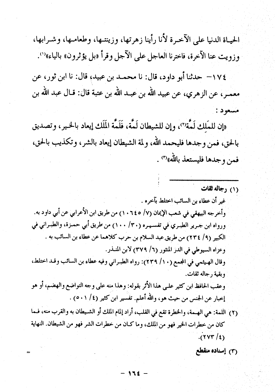 164 - حَدَّثَنَا أَبُو دَاوُدَ قَالَ: نا مُحَمَّدُ بْنُ عُبَيْدٍ، قَالَ: نا ابْنُ ثَوْرٍ، عَنْ مَعْمَرٍ، عَنِ الزُّهْرِيِّ، عَنْ عُبَيْدِ اللَّهِ بْنِ عَبْدِ اللَّهِ بْنِ عُتْبَةَ، قَالَ: قَالَ عَبْدُ اللَّهِ بْنُ مَسْعُودٍ: §إِنَّ لِلْمَلِكِ لَمَّةً، وَإِنَّ لِلشَّيْطَانِ لَمَّةً، فَلَمَّةُ الْمَلِكِ إِيعَادٌ بِالْخَيْرِ وَتَصْدِيقٌ بِالْحَقِّ، فَمَنْ وَجَدَهَا فَلْيَحْمَدِ اللَّهَ، وَلَمَّةُ الشَّيْطَانِ إِيعَادٌ بِالشَّرِّ، وَتَكْذِيبٌ بِالْحَقِّ، فَمَنْ وَجَدَهَا فَلْيَسْتَعِذْ بِاللَّهِ.