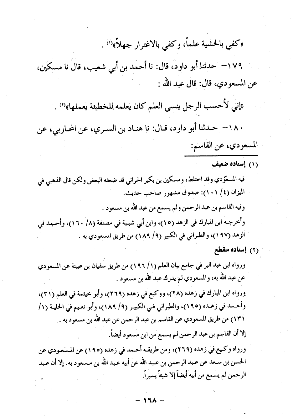 169 - حَدَّثَنَا أَبُو دَاوُدَ قَالَ: نا أَحْمَدُ بْنُ أَبِي شُعَيْبٍ، قَالَ: نا مِسْكِينٌ، عَنِ الْمَسْعُودِيِّ، قَالَ: قَالَ عَبْدُ اللَّهِ: §إِنِّي لَأَحْسِبُ الرَّجُلَ يَنْسَى الْعِلْمَ كَانَ يَعْلَمُهُ لِلْخَطِيئَةِ يَعْمَلُهَا.