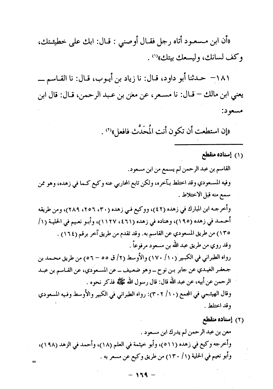 171 - حَدَّثَنَا أَبُو دَاوُدَ قَالَ: نا زِيَادُ بْنُ أَيُّوبَ، قَالَ: نا الْقَاسِمُ يَعْنِي ابْنَ مَالِكٍ قَالَ: نا مِسْعَرٌ، عَنْ مَعْنِ بْنِ عَبْدِ الرَّحْمَنِ، قَالَ: قَالَ ابْنُ مَسْعُودٍ: §إِنِ اسْتَطَعْتَ أَنْ تَكُونَ، أَنْتَ الْمُحَدَّثُ فَافْعَلْ.