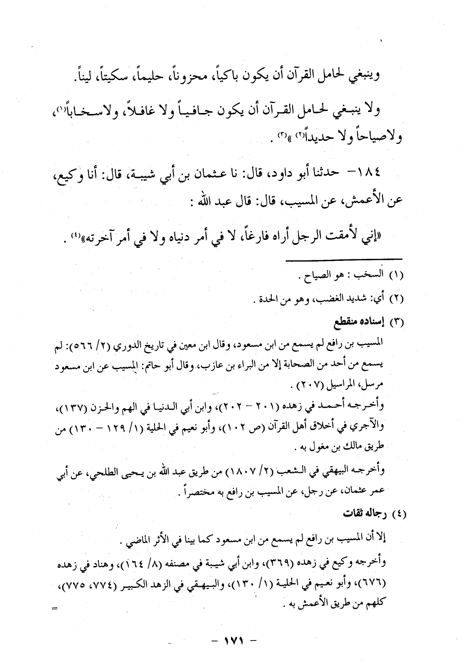 174 - حَدَّثَنَا أَبُو دَاوُدَ قَالَ: نا عُثْمَانُ بْنُ أَبِي شَيْبَةَ، قَالَ: أنا وَكِيعٌ، عَنِ الْأَعْمَشِ، عَنِ الْمُسَيَّبِ، قَالَ: قَالَ عَبْدُ اللَّهِ: §إِنِّي لَأَمْقَتُ الرَّجُلَ أُرَاهُ فَارِغًا، لَا فِي أَمْرِ دُنْيَاهُ وَلَا فِي أَمْرِ آخِرَتِهِ.