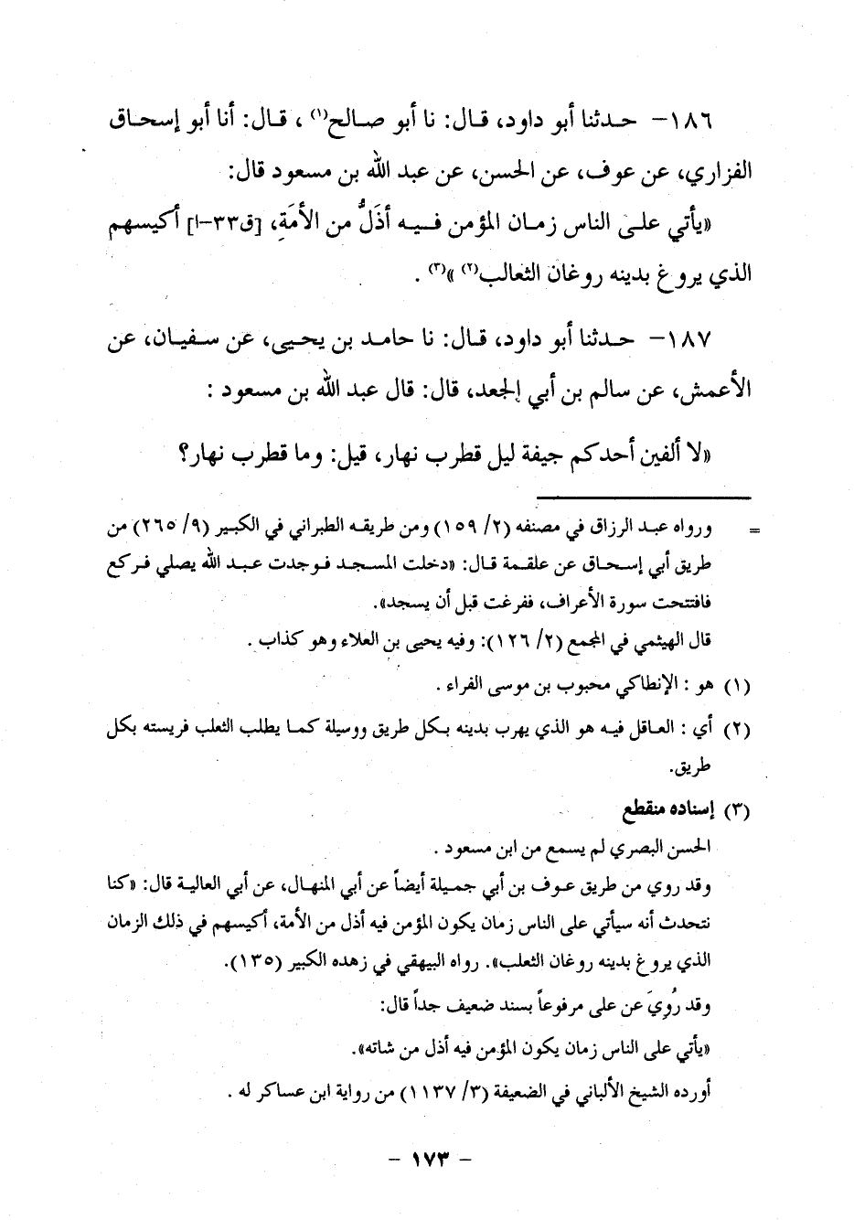 176 - حَدَّثَنَا أَبُو دَاوُدَ قَالَ: نا أَبُو صَالِحٍ، قَالَ: أنا أَبُو إِسْحَاقَ الْفَزَارِيُّ، عَنْ عَوْفٍ، عَنِ الْحَسَنِ، عَنْ عَبْدِ اللَّهِ بْنِ مَسْعُودٍ، قَالَ: §يَأْتِي عَلَى النَّاسِ زَمَانٌ الْمُؤْمِنُ فِيهِ أَذَلُّ مِنَ الْأَمَةِ، أَكْيَسُهُمُ الَّذِي يَرُوغُ بِدِينِهِ رَوَغَانَ الثَّعَالِبِ.