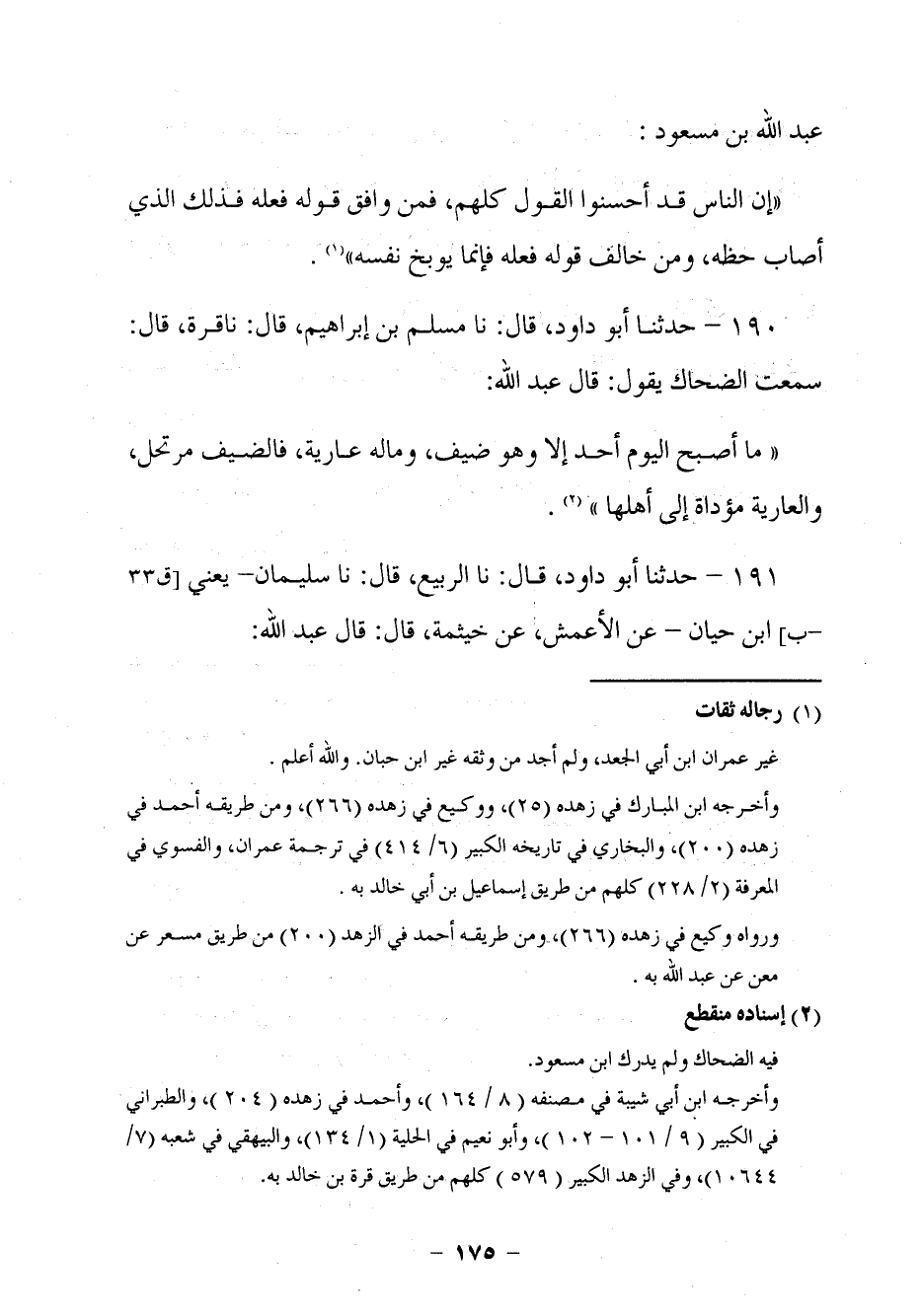 181 - حَدَّثَنَا أَبُو دَاوُدَ قَالَ: نا الرَّبِيعُ قَالَ: نا سُلَيْمَانُ يَعْنِي ابْنَ حَيَّانَ، عَنِ الْأَعْمَشِ، عَنْ خَيْثَمَةَ قَالَ: قَالَ عَبْدُ اللَّهِ: -[176]- §إِنَّ الرَّجُلَ لَيُرِيدُ الْأَمْرَ مِنَ الْإِمَارَةِ، أَوِ التِّجَارَةِ، فَيَذْكُرُهُ اللَّهَ فِي سَبْعِ سَمَاوَاتٍ، فَيَقُولُ لِلْمَلَكِ: اصْرِفْهُ عَنْهُ، فَإِنِّي إِنْ أُيَسِّرْهُ لَهُ أُدْخِلْهُ بِهِ النَّارَ قَالَ: فَيَتَظَنَّى بِجِيرَانِهِ، أَيُّهُمْ دَهَانِي؟ أَيُّهُمْ فَعَلَ بِي؟ وَمَا صَرَفَهُ عَنْهُ إِلَّا اللَّهُ.