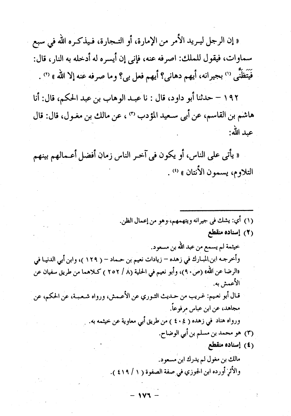 182 - حَدَّثَنَا أَبُو دَاوُدَ قَالَ: نا عَبْدُ الْوَهَّابِ بْنُ عَبْدِ الْحَكَمِ، قَالَ: أنا هَاشِمُ بْنُ الْقَاسِمِ، عَنْ أَبِي سَعِيدٍ الْمُؤَدِّبِ، عَنْ مَالِكِ بْنِ مِغْوَلٍ، قَالَ: قَالَ عَبْدُ اللَّهِ: §يَأْتِي عَلَى النَّاسِ، أَوْ يَكُونُ فِي آخِرِ النَّاسِ زَمَانٌ أَفْضَلُ أَعْمَالِهِمْ بَيْنَهُمُ التَّلَاوُمُ، يُسَمَّوْنَ الْأَنْتَانُ.