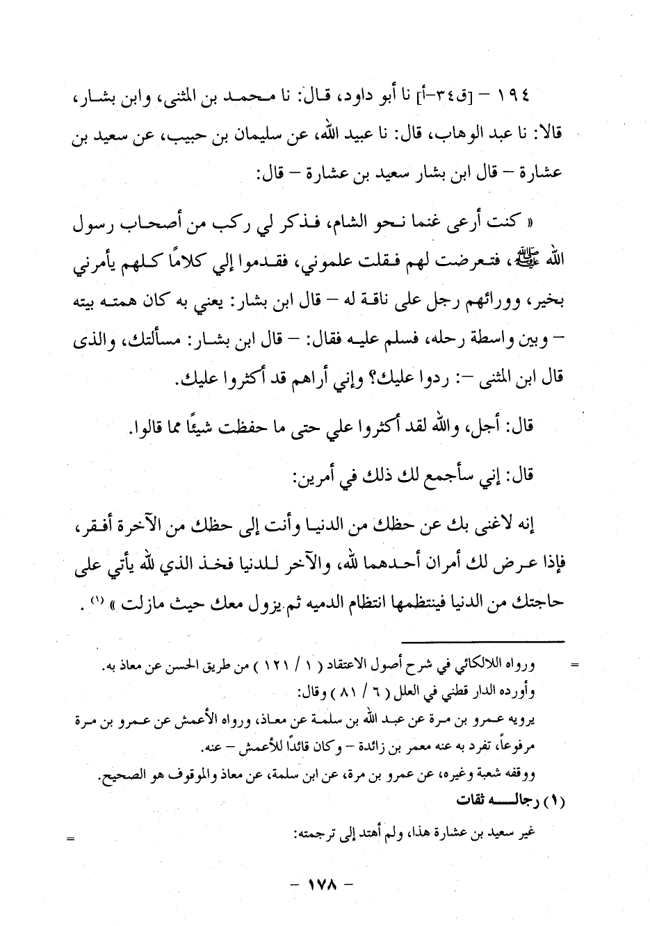 184 - حَدَّثَنَا أَبُو دَاوُدَ قَالَ: نا مُحَمَّدُ بْنُ الْمُثَنَّى، وَابْنُ بَشَّارٍ قَالَا: نا عَبْدُ الْوَهَّابِ، قَالَ: نا عُبَيْدُ اللَّهِ، عَنْ سُلَيْمَانَ بْنِ حَبِيبٍ، عَنْ سَعِيدِ بْنِ عُشَارَةَ قَالَ ابْنُ بَشَّارٍ سَعِيدُ بْنُ عُشَارَةَ قَالَ: §كُنْتُ أَرْعَى غَنَمًا نَحْوَ الشَّامِ، فَذَكَرَ لِي رَكْبٌ مِنْ أَصْحَابِ رَسُولِ اللَّهِ صَلَّى اللَّهُ عَلَيْهِ وَسَلَّمَ، فَتَعَرَّضْتُ لَهُمْ فَقُلْتُ: عَلِّمُونِي، فَقَدَّمُوا إِلَيَّ كَلَامًا كُلُّهُمْ يَأْمُرُنِي بِخَيْرٍ، وَوَرَائَهُمْ رَجُلٌ عَلَى نَاقَةٍ لَهُ قَالَ ابْنُ بَشَّارٍ: يَعْنِي بِهِ كَانَ هِمَّتُهُ بَيْتُهُ وَبَيْنَ وَاسِطَةِ رَحْلِهِ، فَسَلَّمَ عَلَيْهِ فَقَالَ: قَالَ ابْنُ بَشَّارٍ: مَسْأَلَتُكَ، وَالَّذِي قَالَ ابْنُ الْمُثَنَّى: رَدُّوا عَلَيْكَ؟ وَإِنِّي أَرَاهُمْ قَدْ أَكْثَرُوا عَلَيْكَ. قَالَ: أَجَلْ، وَاللَّهِ لَقَدْ أَكْثَرُوا عَلَيَّ حَتَّى مَا حَفِظْتُ شَيْئًا مِمَّا قَالُوا. قَالَ: إِنِّي سَأَجْمَعُ لَكَ ذَلِكَ فِي أَمْرَيْنِ: إِنَّهُ لَا غِنَى بِكَ عَنْ حَظِّكَ مِنَ الدُّنْيَا , وَأَنْتَ إِلَى حَظِّكَ مِنَ الْآخِرَةِ أَفْقَرُ، فَإِذَا عَرَضَ لَكَ أَمْرَانِ أَحَدُهُمَا لِلَّهِ، وَالْآخَرُ لِلدُّنْيَا فَخُذِ الَّذِي لِلَّهِ يَأْتِي عَلَى حَاجَتِكَ مِنَ الدُّنْيَا فَيَنْتَظِمُهَا انْتِظَامَ الدُّمْيَةِ ثُمَّ يَزُولُ مَعَكَ حَيْثُ مَازِلْتَ.
