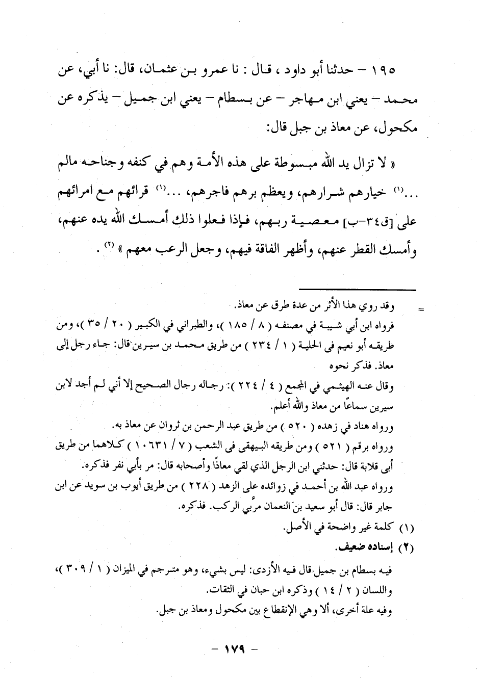 185 - حَدَّثَنَا أَبُو دَاوُدَ قَالَ: نا عَمْرُو بْنُ عُثْمَانَ، قَالَ: نا أَبِي، عَنْ مُحَمَّدٍ يَعْنِي ابْنَ الْمُهَاجِرِ، عَنْ بِسْطَامٍ يَعْنِي ابْنَ جَمِيلٍ يَذْكُرُهُ عَنْ مَكْحُولٍ، عَنْ مُعَاذِ بْنِ جَبَلٍ، قَالَ: §لَا تَزَالُ يَدُ اللَّهِ مَبْسُوطَةً عَلَى هَذِهِ الْأُمَّةِ وَهُمْ فِي كَنَفِهِ وَجَنَاحِهِ مَا لَمْ. . خِيَارُهُمْ شَرَارَهُمْ، وَيُعَظِّمُ بَرُّهُمْ فَاجِرَهُمْ،. . قُرَّائُهُمْ مَعَ أُمَرَائِهِمْ عَلَى مَعْصِيَةِ رَبِّهِمْ، فَإِذَا فَعَلُوا ذَلِكَ أَمْسَكَ اللَّهُ يَدَهُ عَنْهُمْ، وَأَمْسَكَ الْقَطْرَ عَنْهُمْ، وَأَظْهَرَ الْفَاقَةَ فِيهِمْ، وَجَعَلَ الرُّعْبَ مَعَهُمْ.