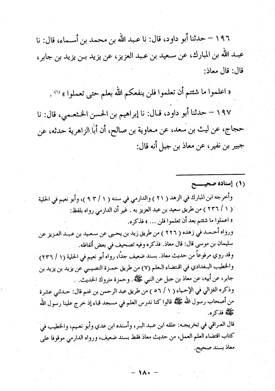 186 - حَدَّثَنَا أَبُو دَاوُدَ قَالَ: نا عَبْدُ اللَّهِ بْنُ مُحَمَّدِ بْنِ أَسْمَاءٍ، قَالَ: نا عَبْدُ اللَّهِ بْنُ الْمُبَارَكِ، عَنْ سَعِيدِ بْنِ عَبْدِ الْعَزِيزِ، عَنْ يَزِيدَ بْنِ يَزِيدَ بْنِ جَابِرٍ، قَالَ: قَالَ مُعَاذٌ: §اعْلَمُوا مَا شِئْتُمْ أَنْ تَعْلَمُوا فَلَنْ يَنْفَعُكُمُ اللَّهُ بِعِلْمٍ حَتَّى تَعْمَلُوا.