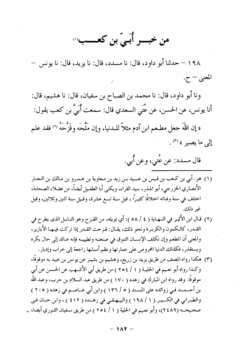 188 - حَدَّثَنَا أَبُو دَاوُدَ قَالَ: نا مُسَدَّدٌ، قَالَ: نا يَزِيدُ، قَالَ: نا يُونُسُ الْمَعْنَى ح ونَا أَبُو دَاوُدَ قَالَ: نا مُحَمَّدُ بْنُ الصَّبَّاحِ بْنِ سُفْيَانَ، قَالَ: نا هُشَيْمٌ، قَالَ: أنا يُونُسُ، عَنِ الْحَسَنِ، عَنْ عُتَيٍّ السَّعْدِيِّ، قَالَ: سَمِعْتُ أُبَيَّ بْنَ كَعْبٍ، يَقُولُ: §إِنَّ اللَّهَ جَعَلَ مَطْعَمَ ابْنِ آدَمَ مَثَلًا لِلدُّنْيَا، وَإِنْ مَلَّحَهُ وَقَزَّحَهُ فَقَدْ عَلِمَ إِلَى مَا يَصِيرُ. قَالَ: مُسَدَّدٌ: عَنْ عُتَيٍّ، وَعَنْ أُبَيٍّ.