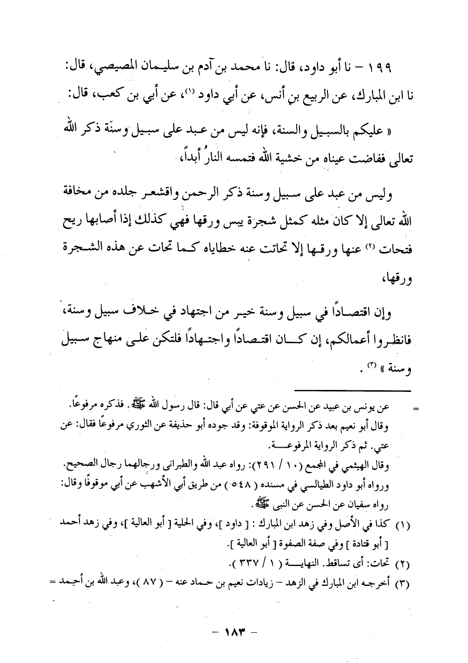 189 - حَدَّثَنَا أَبُو دَاوُدَ قَالَ: نا مُحَمَّدُ بْنُ آدَمَ بْنِ سُلَيْمَانَ الْمِصِّيصِيُّ، قَالَ: نا ابْنُ الْمُبَارَكُ، عَنِ الرَّبِيعِ بْنِ أَنَسٍ، عَنْ أَبِي دَاوُدَ، عَنْ أُبَيِّ بْنِ كَعْبٍ، قَالَ: §عَلَيْكُمْ بِالسَّبِيلِ وَالسُّنَّةِ، فَإِنَّهُ لَيْسَ مِنْ عَبْدٍ عَلَى سَبِيلٍ وَسُنَّةٍ ذَكَرَ اللَّهَ تَعَالَى فَفَاضَتْ عَيْنَاهُ مِنْ خَشْيَةِ اللَّهِ فَتَمَسُّهُ النَّارُ أَبَدًا. وَلَيْسَ مِنْ عَبْدٍ عَلَى سَبِيلٍ وَسُنَّةٍ ذَكَرَ الرَّحْمَنَ وَاقْشَعَرَّ جِلْدُهُ مِنْ مَخَافَةِ اللَّهِ تَعَالَى إِلَّا كَانَ مَثَلُهُ كَمَثَلِ شَجَرَةٍ يَبِسَ وَرَقُهَا فَهِيَ كَذَلِكَ إِذَا أَصَابَهَا رِيحٌ فَتَحَاتَّ عَنْهَا وَرَقُهَا إِلَّا تَحَاتَّتْ عَنْهُ خَطَايَاهُ كَمَا تَحَاتَّ عَنْ هَذِهِ الشَّجَرَةِ وَرَقُهَا، وَإِنَّ اقْتِصَادًا فِي سَبِيلٍ وَسُنَّةٍ خَيْرٌ مِنَ اجْتِهَادٍ فِي خِلَافِ سَبِيلٍ وَسُنَّةٍ، فَانْظُرُوا أَعْمَالَكُمْ، إِنْ كَانَ اقْتِصَادًا وَاجْتِهَادًا فَلْتَكُنْ عَلَى مِنْهَاجِ سَبِيلٍ وَسُنَّةٍ.
