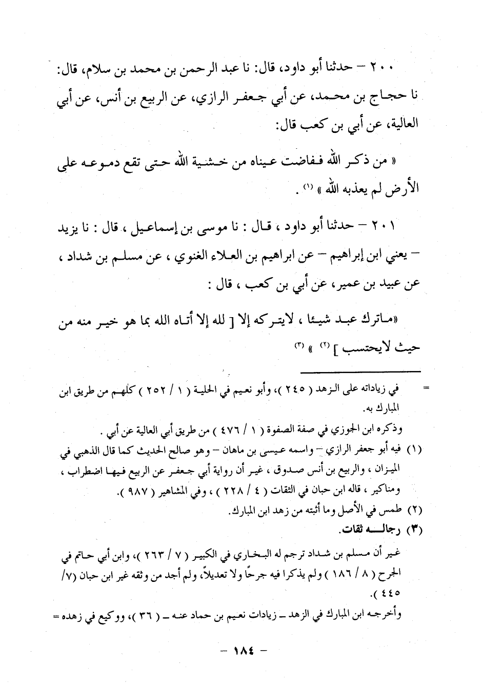 190 - حَدَّثَنَا أَبُو دَاوُدَ قَالَ: نا عَبْدُ الرَّحْمَنِ بْنُ مُحَمَّدِ بْنِ سَلَّامٍ، قَالَ: نا حَجَّاجُ بْنُ مُحَمَّدٍ، عَنْ أَبِي جَعْفَرٍ الرَّازِيِّ، عَنِ الرَّبِيعِ بْنِ أَنَسٍ، عَنْ أَبِي الْعَالِيَةِ، عَنْ أُبَيِّ بْنِ كَعْبٍ، قَالَ: §مَنْ ذَكَرَ اللَّهَ فَفَاضَتْ عَيْنَاهُ مِنْ خَشْيَةِ اللَّهِ حَتَّى تَقَعَ دُمُوعُهُ عَلَى الْأَرْضِ لَمْ يُعَذِّبْهُ اللَّهُ.