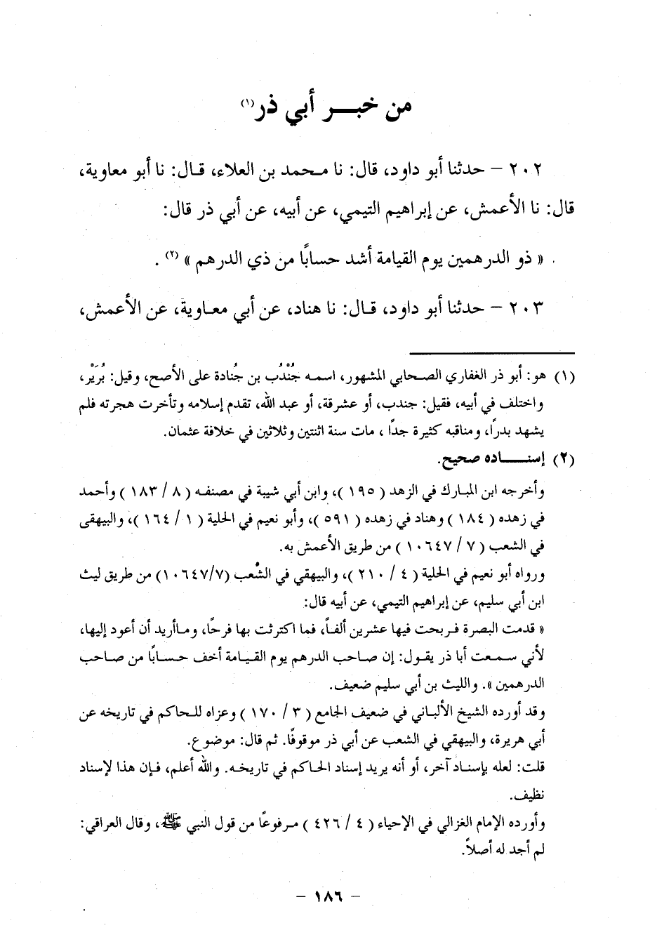 192 - حَدَّثَنَا أَبُو دَاوُدَ قَالَ: نا مُحَمَّدُ بْنُ الْعَلَاءِ، قَالَ: نا أَبُو مُعَاوِيَةَ، قَالَ: نا الْأَعْمَشُ، عَنْ إِبْرَاهِيمَ التَّيْمِيِّ، عَنْ أَبِيهِ، عَنْ أَبِي ذَرٍّ، قَالَ: §ذُو الدِّرْهَمَيْنِ يَوْمَ الْقِيَامَةِ أَشَدُّ حِسَابًا مِنْ ذِي الدِّرْهَمِ.