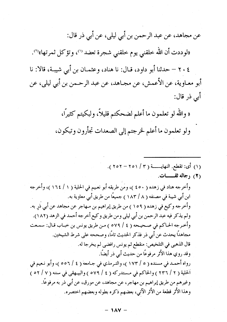 194 - حَدَّثَنَا أَبُو دَاوُدَ قَالَ: نا هَنَّادٌ، وَعُثْمَانُ بْنُ أَبِي شَيْبَةَ، قَالَا: نا أَبُو مُعَاوِيَةَ، عَنِ الْأَعْمَشِ، عَنْ مُجَاهِدٍ، عَنْ عَبْدِ الرَّحْمَنِ بْنِ أَبِي لَيْلَى، عَنْ أَبِي ذَرٍّ، قَالَ: وَاللَّهِ §لَوْ تَعْلَمُونَ مَا أَعْلَمُ لَضَحِكْتُمْ قَلِيلًا، وَلَبَكَيْتُمْ كَثِيرًا، وَلَوْ تَعْلَمُونَ مَا أَعْلَمُ لَخَرَجْتُمْ إِلَى الصُّعُدَاتِ تَجْأَرُونَ وَتَبْكُونَ، -[188]- وَلَوْ تَعْلَمُونَ مَا أَعْلَمُ مَا انْبَسَطْتُمْ إِلَى نِسَائِكُمْ، وَمَا تَقَارَرْتُمْ عَلَى فُرُشِكُمْ.