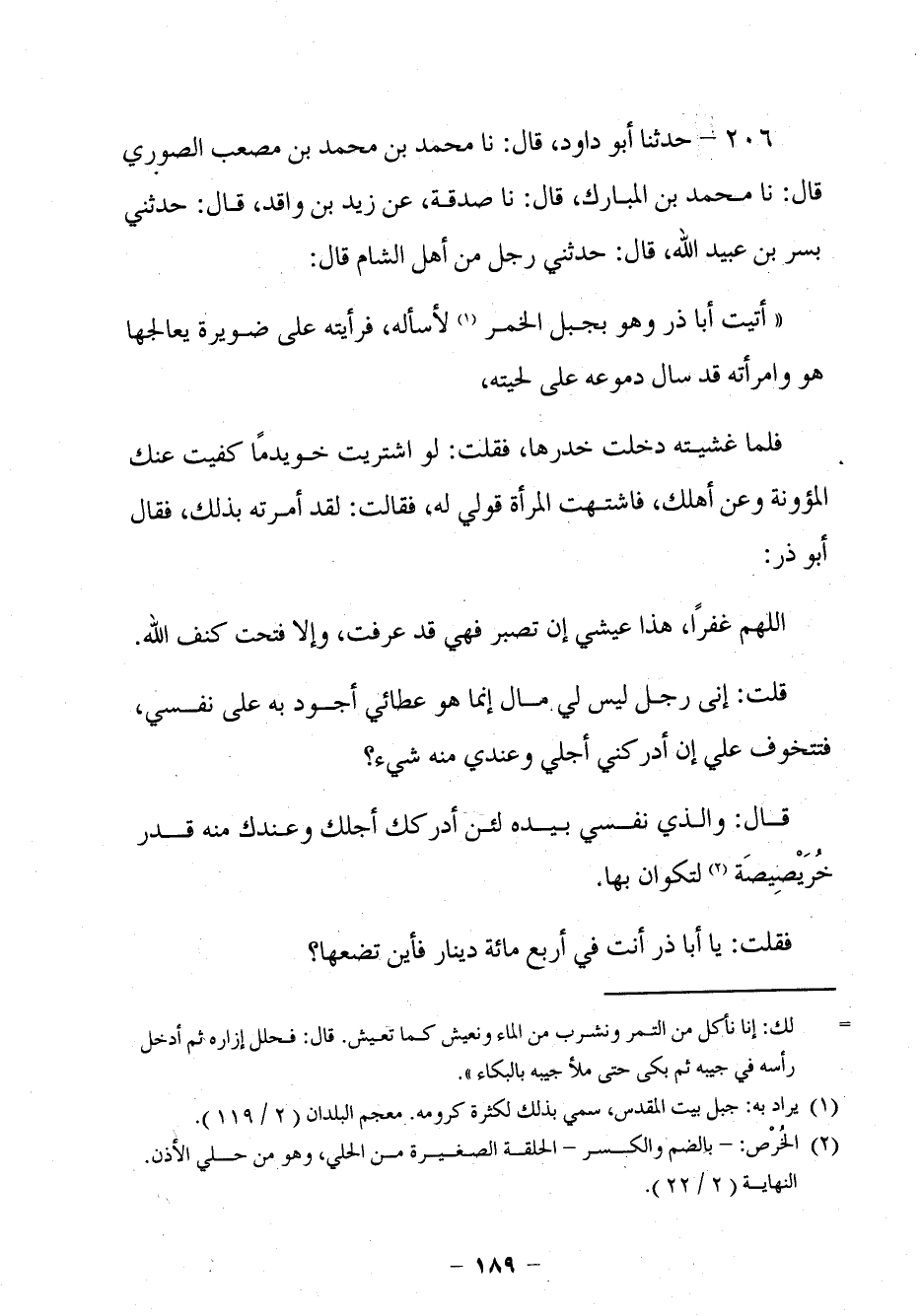 196 - حَدَّثَنَا أَبُو دَاوُدَ قَالَ: نا مُحَمَّدُ بْنُ مُحَمَّدِ بْنِ مُصْعَبٍ الصُّورِيُّ، قَالَ: نا مُحَمَّدُ بْنُ الْمُبَارَكِ، قَالَ: نا صَدَقَةُ، عَنْ زَيْدِ بْنِ وَاقِدٍ، قَالَ: حَدَّثَنِي بُسْرُ بْنُ عُبَيْدِ اللَّهِ، قَالَ: حَدَّثَنِي رَجُلٌ مِنْ أَهْلِ الشَّامِ قَالَ: §أَتَيْتُ أَبَا ذَرِّ وَهُوَ بِجَبَلِ الْخَمْرِ لِأَسْأَلَهُ، فَرَأَيْتُهُ عَلَى ضُوَيْرَةٍ يُعَالِجُهَا هُوَ وَامْرَأَتُهُ قَدْ سَالَتْ دُمُوعُهُ عَلَى لِحْيَتِهِ، فَلَمَّا غَشِيتُهُ دَخَلَتْ خِدْرِهَا، فَقُلْتُ: لَوِ اشْتَرَيْتَ خُوَيْدِمًا كَفَيْتَ عَنْكَ الْمَؤُونَةَ وَعَنْ أَهْلِكَ، فَاشْتَهَتِ الْمَرْأَةُ قَوْلِي لَهُ، فَقَالَتْ: لَقَدْ أَمَرْتُهُ بِذَلِكَ، فَقَالَ أَبُو ذَرٍّ: اللَّهُمَّ غُفْرًا، هَذَا عَيْشِي إِنْ تَصْبِرْ فَهِيَ قَدْ عَرَفَتْ، وَإِلَّا فَتَحْتَ كَنَفِ اللَّهِ. قُلْتُ: إِنِّي رَجُلٌ لَيْسَ لِي مَالٌ، إِنَّمَا هُوَ عَطَائِي أَجُودُ بِهِ عَلَى نَفْسِي، فَتَتَخَوَّفُ عَلَيَّ إِنْ أَدْرَكَنِي أَجْلِي وَعِنْدِي مِنْهُ شَيْءٌ؟ قَالَ: وَالَّذِي نَفْسِي بِيَدِهِ، لَئِنْ أَدْرَكَكَ أَجَلُكَ وَعِنْدَكَ مِنْهُ قَدْرَ خُرَيْصِيصَةٍ لَتُكْوَيَنَّ بِهَا. فَقُلْتُ: يَا أَبَا ذَرٍّ أَنْتَ فِي أَرْبَعِ مِائَةِ دِينَارٍ فَأَيْنَ تَضَعُهَا؟ -[190]- قَالَ: تَرَى هَذِهِ الْقَرْيَةَ؟ فَإِنَّ لِي فِيهَا ثَلَاثِينَ فَرَسًا، أَحْمِلُ عَلَى خَمْسَةَ عَشَرَ فِي كُلِّ عَامٍ فَإِذَا رَجَعْتُ أَعْقَبْتُهَا بِالْأُخْرَى، ثُمَّ نَظَرْتُ إِلَى مَا يُصْلِحُهَا وَأَجْرَ أُجَرَائِهَا، وَمَا نَفَقَ مِنْهَا أَبْدَلْتُ مَكَانَهُ، ونَظَرْتُ إِلَى قُوتِي وَقُوتِ أَهْلِي فَحَبَسْتُ وَتَصَدَّقْتُ بِالْفَضْلِ