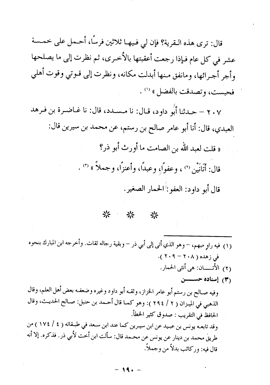 197 - حَدَّثَنَا أَبُو دَاوُدَ قَالَ: نا مُسَدَّدٌ، قَالَ: نا غَاضِرَةُ بْنُ فِرْهَدٍ الْعَبْدِيُّ، قَالَ: أنا أَبُو عَامِرٍ صَالِحُ بْنُ رُسْتُمَ، عَنْ مُحَمَّدِ بْنِ سِيرِينَ، قَالَ: §قُلْتُ لِعَبْدِ اللَّهِ بْنِ الصَّامِتِ: مَا أَوْرَثَ أَبُو ذَرٍّ؟ قَالَ: أَتَانَيْنِ، وَعَفَوْا، وَعَبْدًا، وَأَعْنَزًا، وَجَمَلًا. قَالَ أَبُو دَاوُدَ: الْعَفْوُ: الْحِمَارُ الصَّغِيرُ.