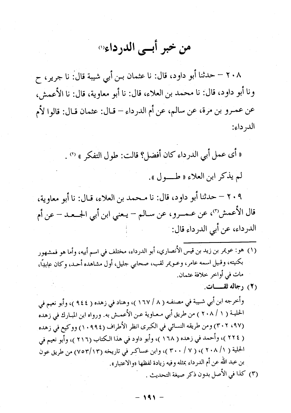 198 - حَدَّثَنَا أَبُو دَاوُدَ قَالَ: نا عُثْمَانُ بْنُ أَبِي شَيْبَةَ، قَالَ: نا جَرِيرٌ ح ونَا أَبُو دَاوُدَ قَالَ: َنا مُحَمَّدُ بْنُ الْعَلَاءِ، قَالَ: نا أَبُو مُعَاوِيَةُ، قَالَ: نا الْأَعْمَشُ، عَنْ عَمْرِو بْنِ مُرَّةَ، عَنْ سَالِمٍ، عَنْ أُمِّ الدَّرْدَاءِ قَالَ: عُثْمَانُ قَالَ: قَالُوا لِأُمِّ الدَّرْدَاءِ: §أَيُّ عَمَلِ أَبِي الدَّرْدَاءِ كَانَ أَفْضَلَ؟ قَالَتْ: طُولُ التَّفَكُّرِ. لَمْ يَذْكُرِ ابْنُ الْعَلَاءِ طُولَ