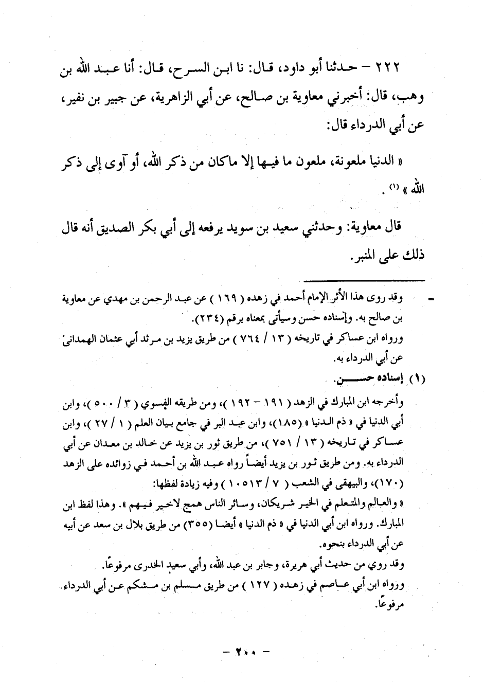 213 - حَدَّثَنَا أَبُو دَاوُدَ قَالَ: نا ابْنُ السَّرْحِ، قَالَ: أنا عَبْدُ اللَّهِ بْنُ وَهْبٍ، قَالَ: أَخْبَرَنِي مُعَاوِيَةُ بْنُ صَالِحٍ، عَنْ أَبِي الزَّاهِرِيَّةِ، عَنْ جُبَيْرِ بْنِ نُفَيْرٍ، عَنْ أَبِي الدَّرْدَاءِ، قَالَ: §الدُّنْيَا مَلْعُونَةُ، مَلْعُونٌ مَا فِيهَا إِلَّا مَا كَانَ مِنْ ذِكْرِ اللَّهِ، أَوْ آوَى إِلَى ذِكْرِ اللَّهِ. قَالَ مُعَاوِيَةُ: وَحَدَّثَنِي سَعِيدُ بْنُ سُوَيْدٍ يَرْفَعُهُ إِلَى أَبِي بَكْرٍ الصِّدِّيقِ أَنَّهُ قَالَ ذَلِكَ عَلَى الْمِنْبَرِ.