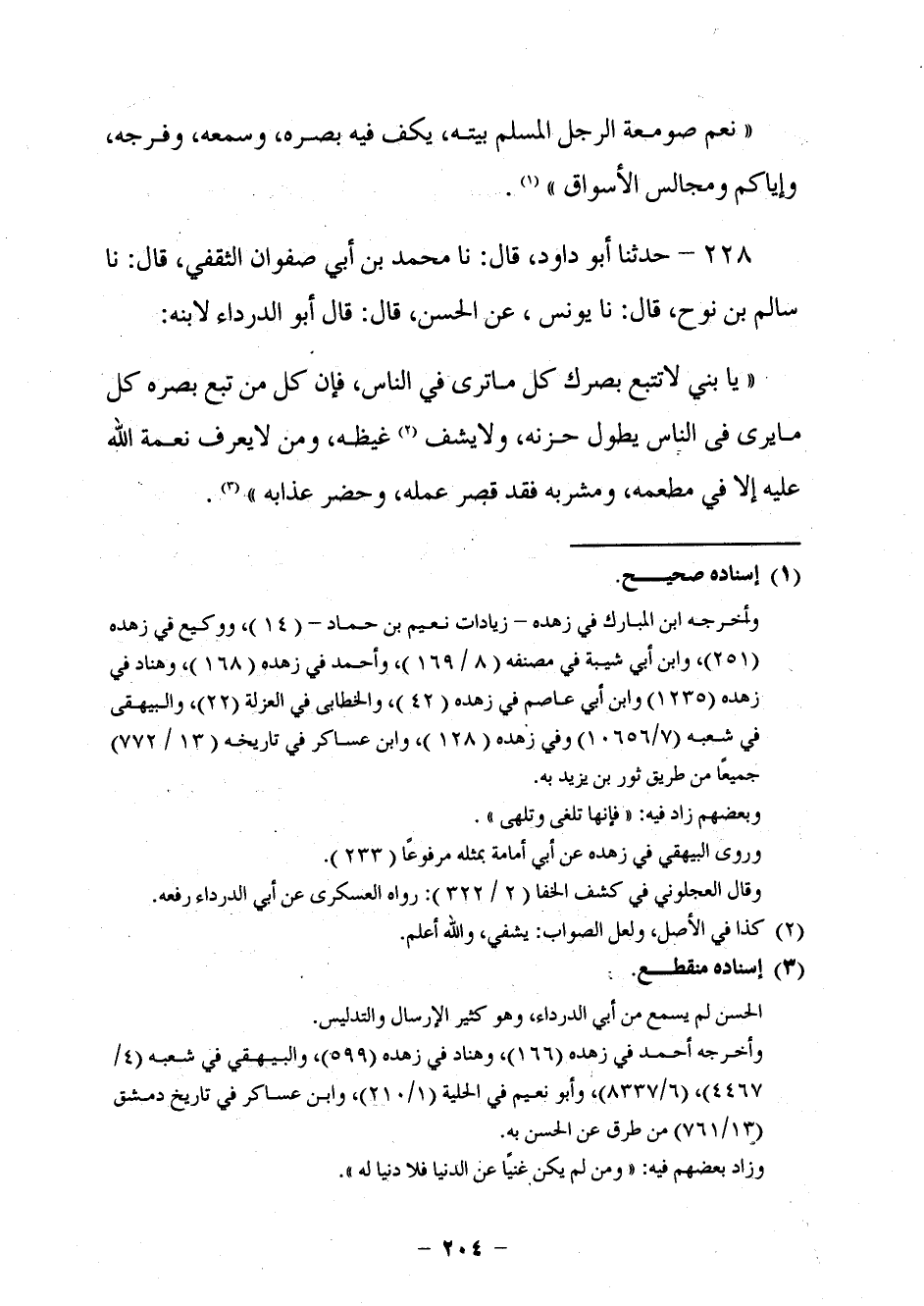 219 - حَدَّثَنَا أَبُو دَاوُدَ قَالَ: نا مُحَمَّدُ بْنُ أَبِي صَفْوَانَ الثَّقَفِيُّ، قَالَ: نا سَالِمُ بْنُ نُوحٍ، قَالَ: نا يُونُسُ، عَنِ الْحَسَنِ، قَالَ: قَالَ أَبُو الدَّرْدَاءِ لِابْنِهِ: يَا بُنَيَّ §لَا تُتْبِعْ بَصَرَكَ كُلَّ مَا تَرَى فِي النَّاسِ، فَإِنَّ كُلَّ مَنْ تَبِعَ بَصَرُهُ كُلَّ مَا يَرَى فِي النَّاسِ يَطُولُ حُزْنُهُ، وَلَا يَشْفِي غَيْظَهُ، وَمَنْ لَا يَعْرَفْ نِعْمَةَ اللَّهِ عَلَيْهِ إِلَّا فِي مَطْعَمِهِ، وَمَشْرَبِهِ فَقَدْ قَصَرَ عَمَلُهُ، وَحَضَرَ عَذَابَهُ