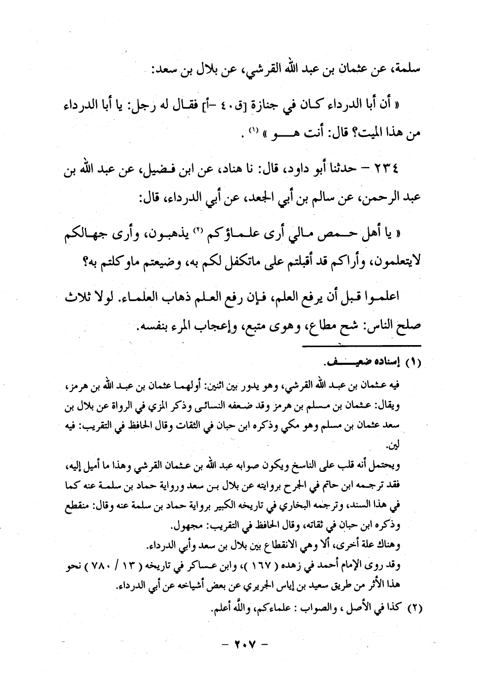 225 - حَدَّثَنَا أَبُو دَاوُدَ قَالَ: نا هَنَّادٌ، عَنِ ابْنِ فُضَيْلٍ، عَنْ عَبْدِ اللَّهِ بْنِ عَبْدِ الرَّحْمَنِ، عَنْ سَالِمِ بْنِ أَبِي الْجَعْدِ، عَنْ أَبِي الدَّرْدَاءِ، قَالَ: يَا أَهْلَ حِمْصَ §مَالِي أَرَى عُلَمَاءَكُمْ يَذْهَبُونَ، وَأَرَى جُهَّالَكُمْ لَا يَتَعَلَّمُونَ، وَأَرَاكُمْ قَدْ أَقْبَلْتُمْ عَلَى مَا تُكُفِّلَ لَكُمْ بِهِ، وَضَيَّعْتُمْ مَا وُكِّلْتُمْ بِهِ؟ اعْلَمُوا قَبْلَ أَنْ يُرْفَعَ الْعِلْمُ، فَإِنَّ رَفْعَ الْعِلْمِ ذَهَابُ الْعُلَمَاءِ. لَوْلَا ثَلَاثٌ صَلُحَ النَّاسُ: شُحٌّ مُطَاعٌ، وَهَوًى مُتَّبَعٌ، وَإِعْجَابُ الْمَرْءِ بِنَفْسِهِ. -[208]- مَنْ يُكْثِرْ قَرْعَ الْبَابِ يُفْتَحْ لَهُ، وَمَنْ يُكْثِرِ الدُّعَاءَ فِي الرَّخَاءِ يُسْتَجَابُ لَهُ عِنْدَ الْكَرْبِ، وَمَنْ رُزِقَ قَلْبًا شَاكِرًا، وَلِسَانًا ذَاكِرًا، وَزَوْجَةً مُؤْمِنَةً، فَنِعْمَ الْخَيْرَاتُ لَهُ، لَمْ يَتْرُكْ مِنَ الْخَيْرَاتِ شَيْئًا.