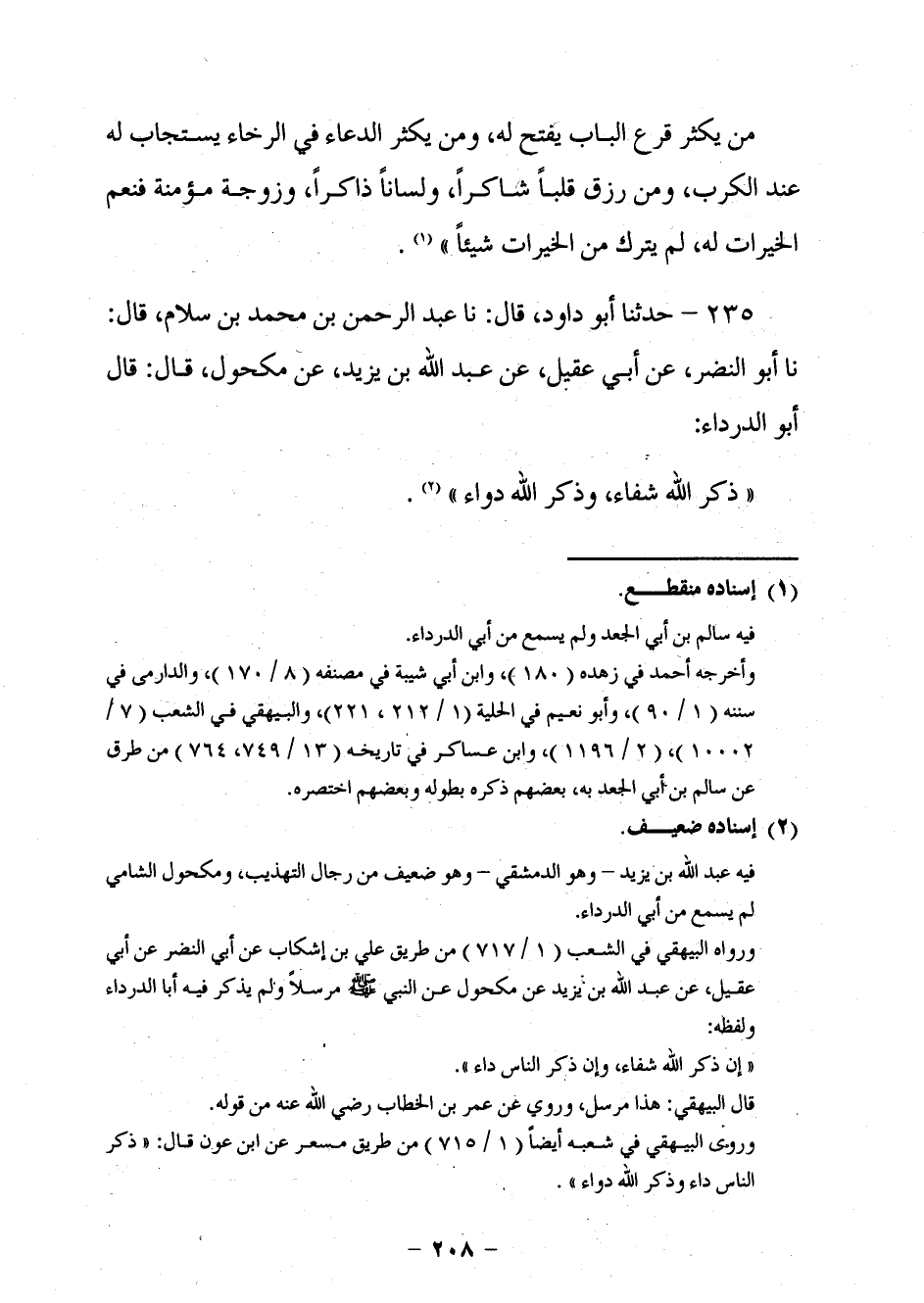 226 - حَدَّثَنَا أَبُو دَاوُدَ قَالَ: نا عَبْدُ الرَّحْمَنِ بْنُ مُحَمَّدِ بْنِ سَلَّامٍ، قَالَ: نا أَبُو النَّضْرِ، عَنْ أَبِي عَقِيلٍ، عَنْ عَبْدِ اللَّهِ بْنِ يَزِيدَ، عَنْ مَكْحُولٍ، قَالَ: قَالَ أَبُو الدَّرْدَاءِ: §ذِكْرُ اللَّهِ شِفَاءٌ، وَذِكْرُ اللَّهِ دَوَاءٌ.