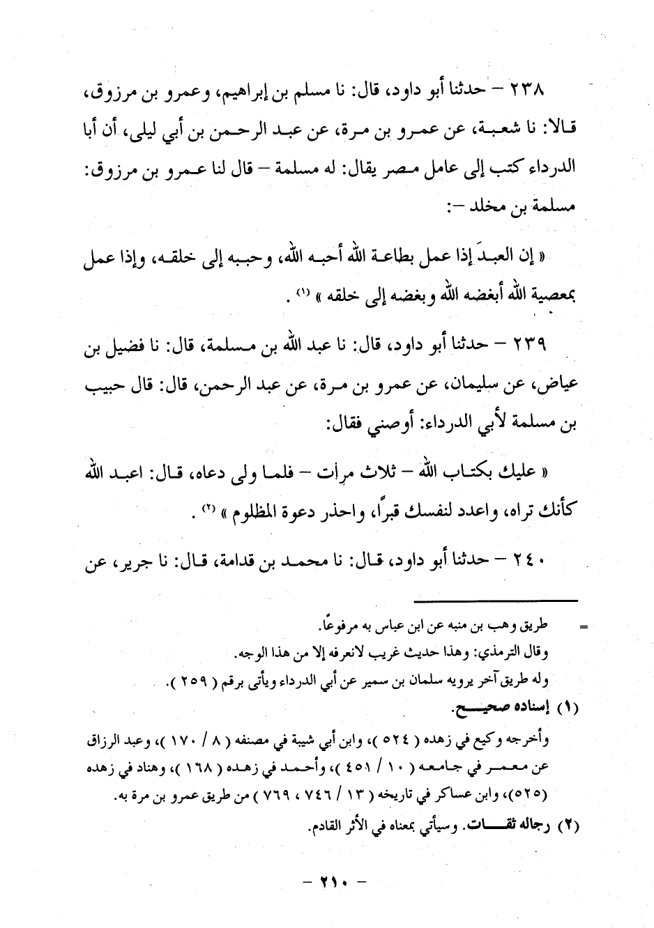 230 - حَدَّثَنَا أَبُو دَاوُدَ قَالَ: نا عَبْدُ اللَّهِ بْنُ مَسْلَمَةَ، قَالَ: نا فُضَيْلُ بْنُ عِيَاضٍ، عَنْ سُلَيْمَانَ، عَنْ عَمْرِو بْنِ مُرَّةَ، عَنْ عَبْدِ الرَّحْمَنِ، قَالَ: قَالَ حَبِيبُ بْنُ مَسْلَمَةَ لِأَبِي الدَّرْدَاءِ: أَوْصِنِي فَقَالَ: §عَلَيْكَ بِكِتَابِ اللَّهِ ثَلَاثَ مَرَّاتٍ فَلَمَّا وَلَّى دَعَاهُ قَالَ: اعْبُدِ اللَّهَ كَأَنَّكَ تَرَاهُ، وَاعْدُدْ لِنَفْسِكَ قَبْرًا، وَاحْذَرْ دَعْوَةَ الْمَظْلُومِ.