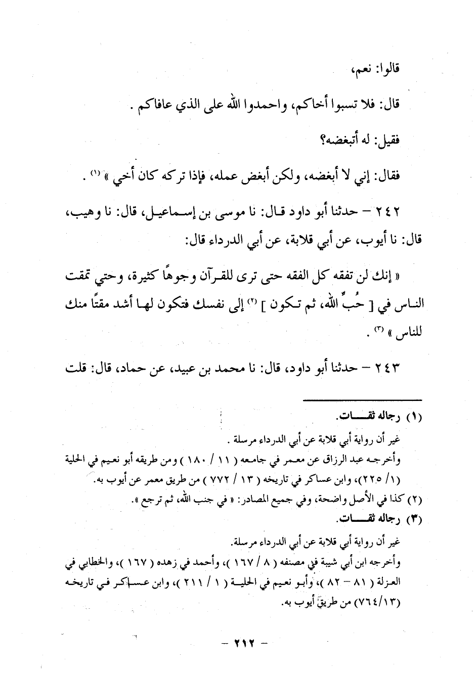 233 - حَدَّثَنَا أَبُو دَاوُدَ قَالَ: نا مُوسَى بْنُ إِسْمَاعِيلَ، قَالَ: نا وَهَيْبٌ، قَالَ: نا أَيُّوبُ، عَنْ أَبِي قِلَابَةَ، عَنْ أَبِي الدَّرْدَاءِ، قَالَ: «§إِنَّكَ لَنْ تَفْقَهَ كُلَّ الْفِقْهِ حَتَّى تَرَى لِلْقُرْآنِ وُجُوهًا كَثِيرَةً، وَحَتَّى تَمْقَتَ النَّاسَ فِي حُبِّ اللَّهِ، ثُمَّ تَكُونَ إِلَى نَفْسِكَ فَتَكُونَ لَهَا أَشَدَّ مَقْتًا مِنْكَ لِلنَّاسِ» حَدَّثَنَا أَبُو دَاوُدَ قَالَ: نا مُحَمَّدُ بْنُ عُبَيْدٍ، عَنْ حَمَّادٍ، قَالَ: قُلْتُ -[213]- لِأَيُّوبَ: أَرَأَيْتُ قَوْلَهُ: حَتَّى تَرَى لِلْقُرْآنِ وُجُوهًا؟ فَأَسْكَتَ يَتَفَكَّرُ. قُلْتُ: هُوَ أَنْ يَرَى لَهُ وُجُوهًا فَيُهَابُ الْإِقْدَامَ عَلَيْهِ؟ قَالَ: هُوَ هَذَا، هُوَ هَذَا
