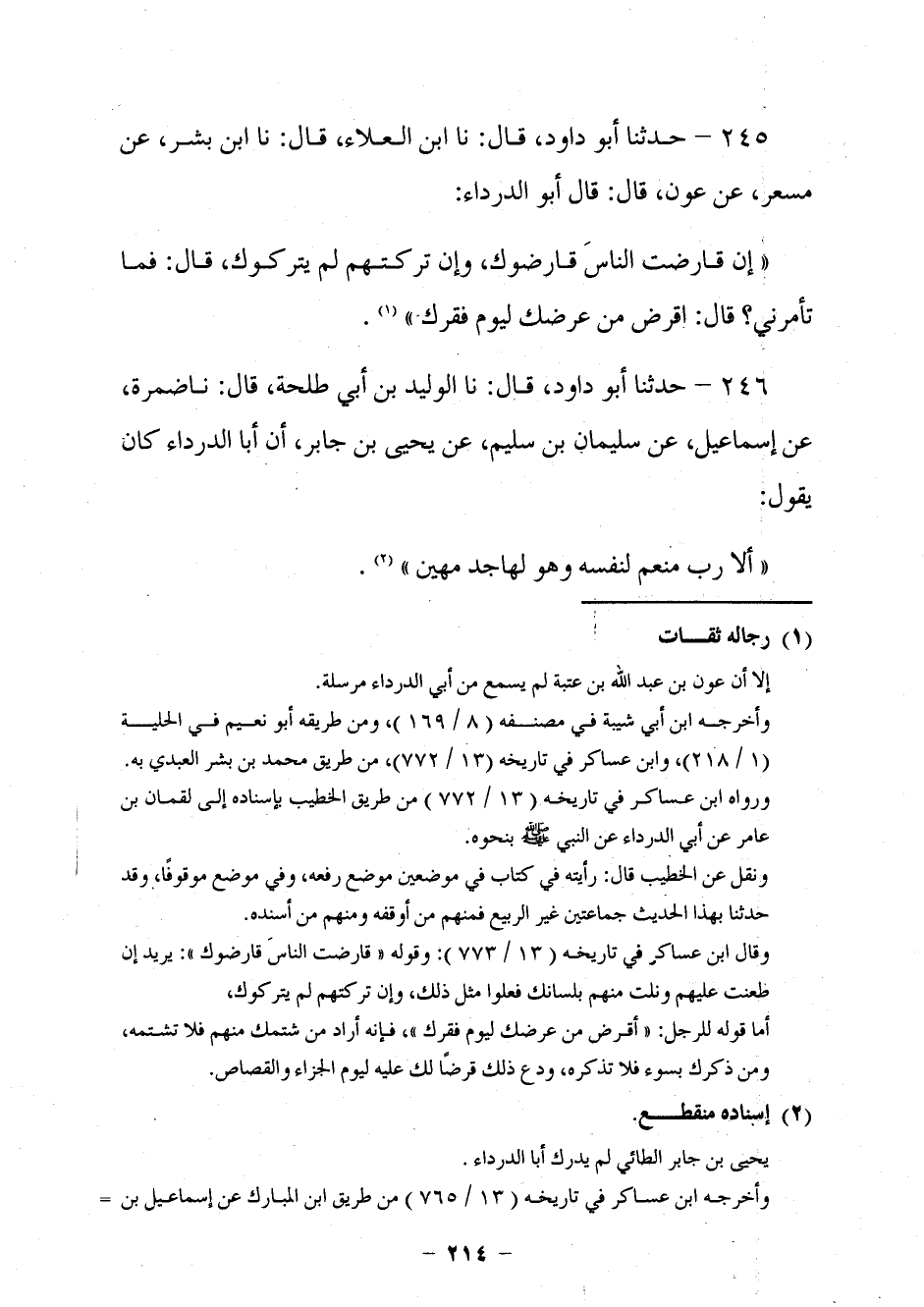 235 - حَدَّثَنَا أَبُو دَاوُدَ قَالَ: نا ابْنُ الْعَلَاءِ، قَالَ: نا ابْنُ بِشْرٍ، عَنْ مِسْعَرٍ، عَنْ عَوْنٍ، قَالَ: قَالَ أَبُو الدَّرْدَاءِ: §إِنْ قَارَضْتَ النَّاسَ قَارَضُوكَ، وَإِنْ تَرَكْتَهُمْ لَمْ يَتْرُكُوكَ قَالَ: فَمَا تَأْمُرُنِي؟ قَالَ: أَقْرِضَ مِنْ عِرْضِكَ لِيَوْمِ فَقْرِكَ