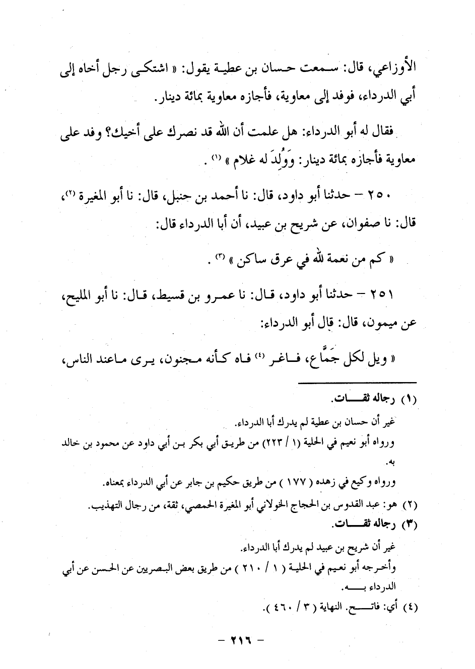 240 - حَدَّثَنَا أَبُو دَاوُدَ قَالَ: نا أَحْمَدُ بْنُ حَنْبَلٍ، قَالَ: نا أَبُو الْمُغِيرَةِ، قَالَ: نا صَفْوَانُ، عَنْ شُرَيْحِ بْنِ عُبَيْدٍ، أَنَّ أَبَا الدَّرْدَاءِ، قَالَ: §كَمْ مِنْ نِعْمَةٍ لِلَّهِ فِي عِرْقٍ سَاكِنٍ.