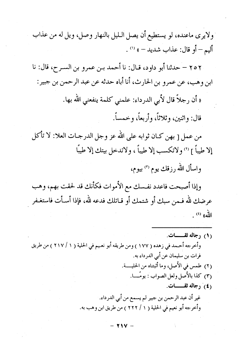 242 - حَدَّثَنَا أَبُو دَاوُدَ قَالَ: نا أَحْمَدُ بْنُ عَمْرِو بْنِ السَّرْحِ، قَالَ: نا ابْنُ وَهْبٍ، عَنْ عَمْرِو بْنِ الْحَارِثِ، أنا أَبَاهُ، حَدَّثَهُ عَنْ عَبْدِ الرَّحْمَنِ بْنِ جُبَيْرٍ: أَنَّ رَجُلًا قَالَ لِأَبِي الدَّرْدَاءِ: عَلِّمْنِي كَلِمَةً يَنْفَعُنِي اللَّهُ بِهَا. قَالَ: " وَاثْنَيْنِ، وَثَلَاثًا، وَأَرْبَعًا، وَخَمْسًا، مَنْ عَمِلَ بِهِنَّ كَانَ ثَوَابُهُ عَلَى اللَّهِ عَزَّ وَجَلَّ الدَّرَجَاتِ الْعُلَا: §لَا تَأْكُلْ إِلَّا طَيِّبًا، وَلَا تَكْسِبْ إِلَّا طَيِّبًا، وَلَا تُدْخِلْ بَيْتَكَ إِلَّا طَيِّبًا , وَاسْأَلِ اللَّهَ رِزْقَكَ يَوْمًا بِيَوْمٍ , وَإِذَا أَصْبَحْتَ فَاعْدُدْ نَفْسَكَ مَعَ الْأَمْوَاتِ فَكَأَنَّكَ قَدْ لَحِقْتَ بِهِمْ، وَهَبْ عِرْضَكَ لِلَّهِ فَمَنْ سَبَّكَ أَوْ شَتَمَكَ أَوْ قَاتَلَكَ فَدَعْهُ لِلَّهِ، فَإِذَا أَسَأْتَ فَاسْتَغْفِرِ اللَّهَ "