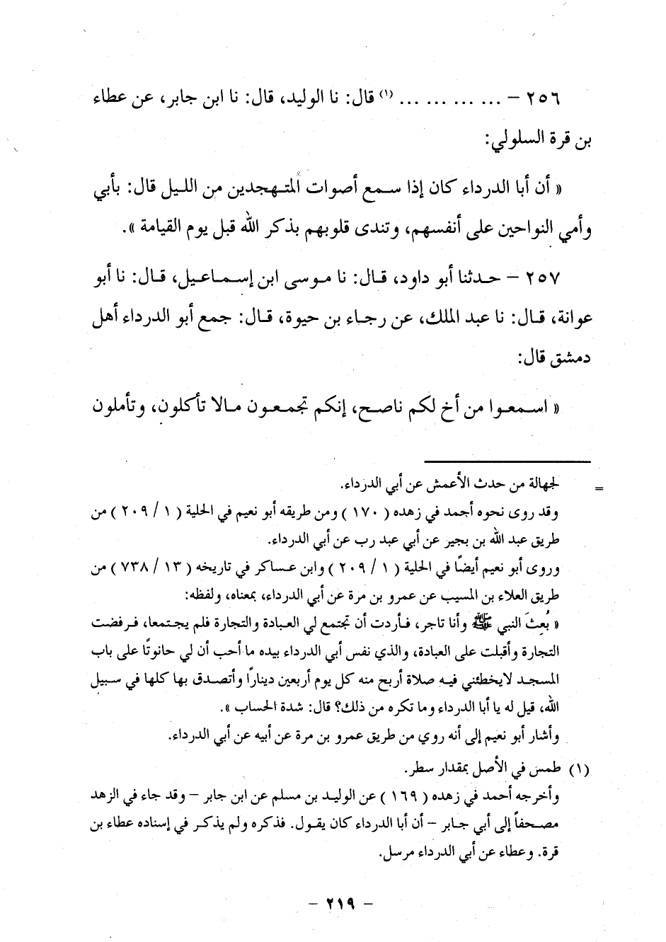 246 -. . . . . . . . قَالَ: نا الْوَلِيدُ، قَالَ: نا ابْنُ جَابِرٍ، عَنْ عَطَاءِ بْنِ قُرَّةَ السَّلُولِيِّ: أَنَّ أَبَا الدَّرْدَاءِ كَانَ إِذَا سَمِعَ أَصْوَاتَ الْمُتَهَجِّدِينَ مِنَ اللَّيْلِ قَالَ: §بِأَبِي وَأُمِّي النَّوَّاحِينَ عَلَى أَنْفُسِهِمْ، وَتَنْدَى قُلُوبُهُمْ بِذِكْرِ اللَّهِ قَبْلَ يَوْمِ الْقِيَامَةِ.