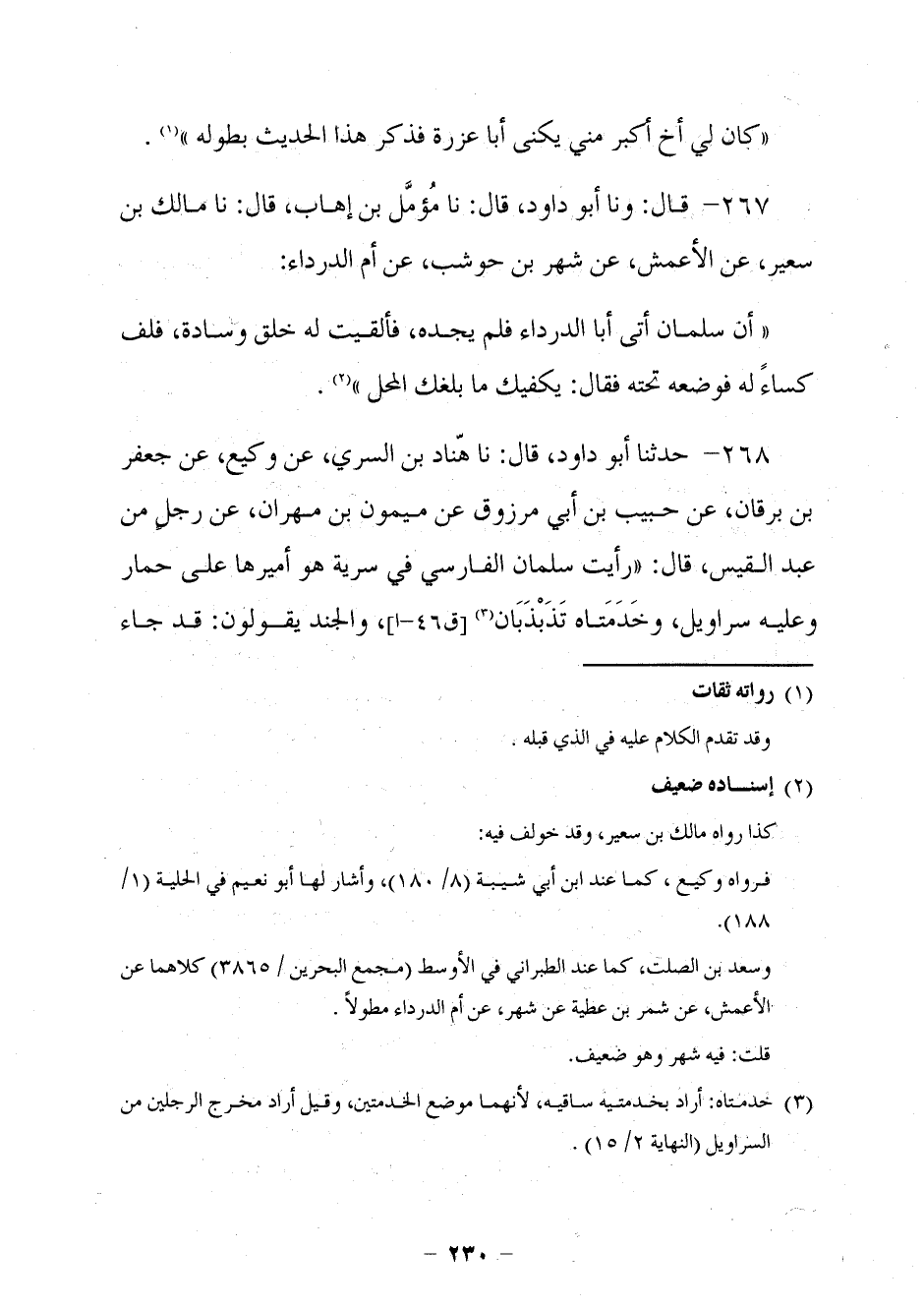 254 - قَالَ: وَنا أَبُو دَاُودَ قَالَ: نا مُؤَمَّلُ بْنُ إِهَابٍ، قَالَ: نا مَالِكُ بْنُ سُعَيْرٍ، عَنِ الْأَعْمَشِ، عَنْ شَهْرِ بْنِ حَوْشَبٍ، عَنْ أُمِّ الدَّرْدَاءِ: §أَنَّ سَلْمَانَ أَتَى أَبَا الدَّرْدَاءِ فَلَمْ يَجِدْهُ، فَأَلْقَيْتُ لَهُ خَلَقَ وِسَادَةٍ، فَلَفَّ كِسَاءً لَهُ فَوَضَعَهُ تَحْتَهُ فَقَالَ: يَكْفِيكَ مَا بَلَغَكَ الْمَحِلُّ.