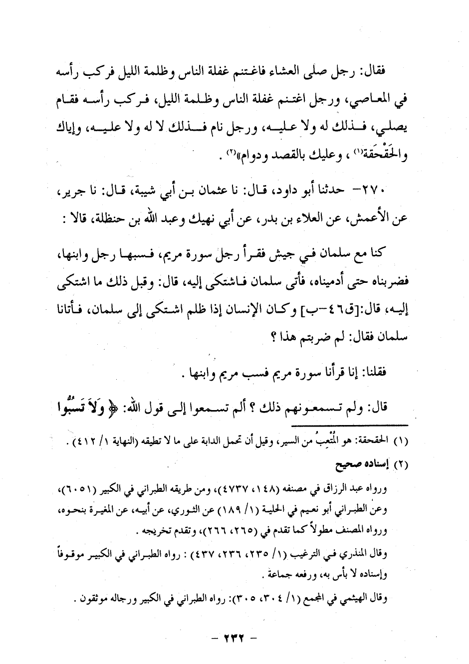 257 - حَدَّثَنَا أَبُو دَاوُدَ قَالَ: نا عُثْمَانُ بْنُ أَبِي شَيْبَةَ، قَالَ: نا جَرِيرٌ، عَنِ الْأَعْمَشِ، عَنِ الْعَلَاءِ بْنِ بَدْرٍ، عَنْ أَبِي نَهِيكٍ، وَعَبْدِ اللَّهِ بْنِ حَنْظَلَةَ، قَالَا: §كُنَّا مَعَ سَلْمَانَ فِي جَيْشٍ فَقَرَأَ رَجُلٌ سُورَةَ مَرْيَمَ، فَسَبَّهَا رَجُلٌ وَابْنَهَا، فَضَرَبْنَاهُ حَتَّى أَدْمَيْنَاهُ، فَأَتَى سَلْمَانُ فَاشْتَكَى إِلَيْهِ قَالَ: وَقَبْلَ ذَلِكَ مَا اشْتَكَى إِلَيْهِ قَالَ: وَكَانَ الْإِنْسَانُ إِذَا ظُلِمَ اشْتَكَى إِلَى سَلْمَانَ، فَأَتَانَا سَلْمَانُ فَقَالَ: لِمَ ضَرَبْتُمْ هَذَا؟ فَقُلْنَا: إِنَّا قَرَأْنَا سُورَةَ مَرْيَمَ فَسَبَّ مَرْيَمَ وَابْنَهَا قَالَ: وَلِمَ تُسْمِعُونَهُمْ ذَلِكَ؟ أَلَمْ تَسْمَعُوا إِلَى قَوْلِ اللَّهِ: {وَلَا تَسُبُّوا -[233]- الَّذِينَ يَدْعُونَ مِنْ دُونِ اللَّهِ فَيَسُبُّوا اللَّهَ عَدْوًا} [الأنعام: 108] الْآيَةَ ثُمَّ قَالَ: يَا مَعْشَرَ الْعَرَبِ، أَلَمْ تَكُونُوا شَرَّ النَّاسِ دِينًا، وَشَرَّ النَّاسِ دَارًا، وَشَرَّ النَّاسِ عَيْشًا، فَأَعَزَّكُمُ اللَّهُ وَأَعْطَاكُمْ، فَتُرِيدُونَ أَنْ تَأْخُذُوا النَّاسَ بِعِزَّةِ اللَّهِ؟ وَاللَّهِ لَتَنْتَهُنَّ أَوْ لَيَأْخُذَنَّ اللَّهُ مَا فِي أَيْدِيكُمْ وَلَيُعْطِيَنَّهُ غَيْرَكُمْ قَالَ: ثُمَّ أَخَذَ يُعَلِّمُنَا فَقَالَ: صَلُّوا مَا بَيْنَ صَلَاتَيِ الْعِشَاءِ، فَإِنَّ أَحَدَكُمْ يُخَفِّفُ عَنْهُ مِنْ حِزْبُهُ، وَيَذْهَبُ مَلْغَاةَ أَوَّلِ اللَّيْلِ، فَإِنَّ مَلْغَاةَ أَوَّلِ اللَّيْلِ مَهْدَنَةٌ لِآخِرِهِ