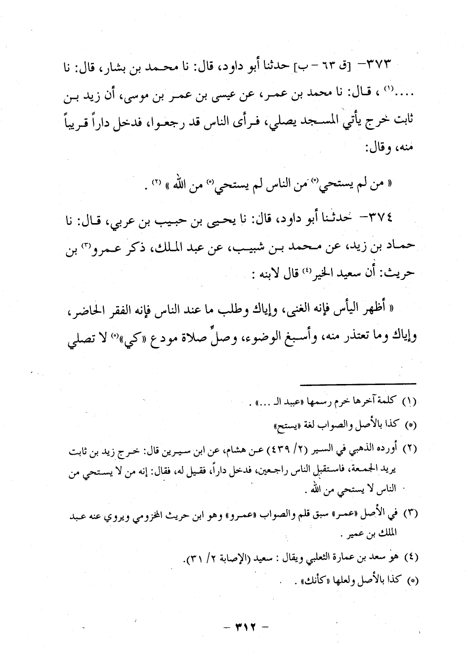 359 - حَدَّثَنَا أَبُو دَاوُدَ قَالَ: نا مُحَمَّدُ بْنُ بَشَّارٍ، قَالَ: نا. . قَالَ: نا مُحَمَّدُ بْنُ عُمَرَ، عَنْ عِيسَى بْنِ عُمَرَ بْنِ مُوسَى، أَنَّ زَيْدَ بْنَ ثَابِتٍ خَرَجَ يَأْتِي الْمَسْجِدَ يُصَلِّي، فَرَأَى النَّاسَ قَدْ رَجَعُوا، فَدَخَلَ دَارًا قَرِيبًا مِنْهُ وَقَالَ: §مَنْ لَمْ يَسْتَحِ مِنَ النَّاسِ لَمْ يَسْتَحِ مِنَ اللَّهِ.