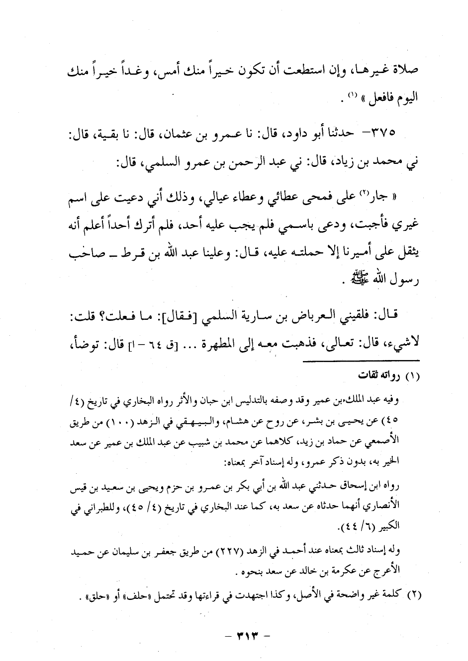 361 - حَدَّثَنَا أَبُو دَاوُدَ قَالَ: حَدَّثَنَا أَبُو دَاوُدَ قَالَ: نا عَمْرُو بْنُ عُثْمَانَ، قَالَ: نا بَقِيَّةُ، قَالَ: ني مُحَمَّدُ بْنُ زِيَادٍ، قَالَ: نِي عَبْدُ الرَّحْمَنِ بْنُ عَمْرٍو السُّلَمِيُّ، قَالَ: §جَارَ عَلَيَّ فَمَحَى عَطَائِي وَعَطَاءَ عِيَالِي، وَذَلِكَ أَنِّي دُعِيتُ عَلَى اسْمِ غَيْرِي فَأَجَبْتُ، وَدُعِيَ بِاسْمِي فَلَمْ يُجِبْ عَلَيْهِ أَحَدٌ، فَلَمْ أَتْرُكْ أَحَدًا أَعْلَمُ أَنَّهُ يُثْقِلُ عَلَى أَمِيرِنَا إِلَّا حَمَلْتُهُ عَلَيْهِ قَالَ: وَعَلَيْنَا عَبْدُ اللَّهِ بْنُ قُرْطٍ صَاحِبُ رَسُولِ اللَّهِ صَلَّى اللَّهُ عَلَيْهِ وَسَلَّمَ. قَالَ: فَلَقِيَنِي الْعِرْبَاضُ بْنُ سَارِيَةَ السُّلَمِيُّ فَقَالَ: مَا فَعَلْتَ؟ قُلْتُ: لَا شَيْءَ , قَالَ: تَعَالَى، فَذَهَبْتُ مَعَهُ إِلَى الْمَطْهَرَةِ. . قَالَ: تَوَضَّأْ، -[314]- فَتَوَضَّأْتُ وَتَوَضَّأَ مَعِي ثُمَّ دَخَلْنَا الْمَسْجِدَ، ثُمَّ قَالَ لِي: مَا كُنْتَ سَائِلَهُ ابْنَ قُرْطٍ فَاسْأَلِ اللَّهَ، فَإِنَّهُ هُوَ الَّذِي يُعْطِي وَيَمْنَعُ، ثُمَّ قَالَ لِي: ارْكَعْ رَكْعَتَيْنِ ثُمَّ ادْعُ وَأُعِينُكَ , قَالَ: فَرَكَعْتُ رَكْعَتَيْنِ رَكْعَتَيْنِ قَالَ: ثُمَّ دَعَوْنَا، فَمَا بَرِحْنَا حَتَّى أَتَانَا رَسُولُهُ يَقُولُ: أَيْنَ ابْنُ عَمْرٍو السُّلَمِيُّ؟ قَالَ: فَصَعِدْتُ إِلَيْهِ. فَقَالَ: أَخْبِرْنِي مَا صَنَعْتَ؟ فَأَخْبَرْتُهُ الْخَبَرَ، فَقَالَ: أَفَلَا سَأَلْتُمَا اللَّهَ الْجَنَّةَ، ثُمَّ قَالَ: لَقَدْ عُرِضَتْ عَلَيَّ حَاجَتُكَ كَأَنِّي أَنْظُرُ إِلَيْهَا، فَرَدَّ عَلَيَّ عَطَائِي وَعَطَاءَ عِيَالِي