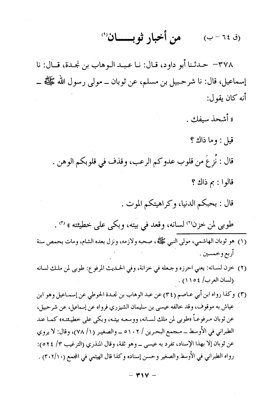 364 - حَدَّثَنَا أَبُو دَاوُدَ قَالَ: نا عَبْدُ الْوَهَّابِ بْنُ نَجْدَةَ، قَالَ: نا إِسْمَاعِيلُ، قَالَ: نا شُرَحْبِيلُ بْنُ مُسْلِمٍ، عَنْ ثَوْبَانَ مَوْلَى رَسُولِ اللَّهِ صَلَّى اللَّهُ عَلَيْهِ وَسَلَّمَ أَنَّهُ كَانَ يَقُولُ: §اشْحَذْ سَيْفَكَ. قِيلَ: وَمَا ذَاكَ؟ قَالَ: نُزِعَ مِنْ قُلُوبِ عَدُوِّكُمُ الرُّعْبُ، وَقُذِفَ فِي قُلُوبِكُمُ الْوَهَنُ. قَالُوا: بِمَ ذَاكَ؟ قَالَ: بِحُبِّكُمُ الدُّنْيَا، وَكَرَاهِيِتِكُمُ الْمَوْتَ. طُوبَى لِمَنْ خَزَنَ لِسَانَهُ، وَقَعَدَ فِي بَيْتِهِ، وَبَكَى عَلَى خَطِيئَتِهِ.