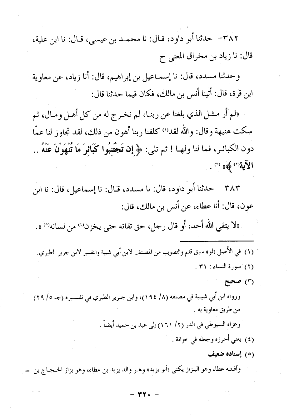 367 - حَدَّثَنَا أَبُو دَاوُدَ قَالَ: نا مُحَمَّدُ بْنُ عِيسَى، قَالَ: نا ابْنُ عُلَيَّةَ، قَالَ: نا زِيَادُ بْنُ مِخْرَاقٍ الْمَعْنِيُّ. حَ. وَحَدَّثَنَا مُسَدَّدٌ، قَالَ: نَا إِسْمَاعِيلُ بْنُ إِبْرَاهِيمَ، قَالَ: أنا زِيَادٌ، عَنْ مُعَاوِيَةَ بْنِ قُرَّةَ، قَالَ: أَتَيْنَا أَنَسَ بْنَ مَالِكٍ، فَكَانَ فِيمَا حَدَّثَنَا قَالَ: §لَمْ أَرَ مِثْلَ الَّذِي بَلَغَنَا عَنْ رَبِّنَا، لَمْ نَخْرُجْ لَهُ مِنْ كُلِّ أَهْلٍ وَمَالٍ، ثُمَّ سَكَتَ هُنَيْهَةً وَقَالَ: وَاللَّهِ لَقَدْ كَلَّفَنَا رَبُّنَا أَهْوَنَ مِنْ ذَلِكَ، لَقَدْ تَجَاوَزَ لَنَا عَمَّا دُونَ الْكَبَائِرِ، فَمَا لَنَا وَلَهَا ثُمَّ تَلَى: {إِنْ تَجْتَنِبُوا كَبَائِرَ مَا تُنْهَوْنَ عَنْهُ} [النساء: 31] . . الْآيَةَ.