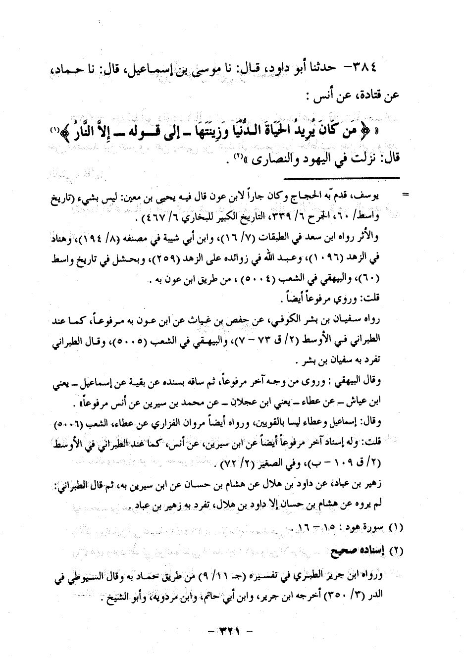 369 - حَدَّثَنَا أَبُو دَاوُدَ قَالَ: نا مُوسَى بْنُ إِسْمَاعِيلَ، قَالَ: نا حَمَّادٌ، عَنْ قَتَادَةَ، عَنْ أَنَسٍ: {§مَنْ كَانَ يُرِيدُ الْحَيَاةَ الدُّنْيَا وَزِينَتَهَا} [هود: 15] إِلَى قَوْلِهِ {إِلَّا النَّارُ} [البقرة: 174] قَالَ: «نَزَلَتْ فِي الْيَهُودِ وَالنَّصَارَى»