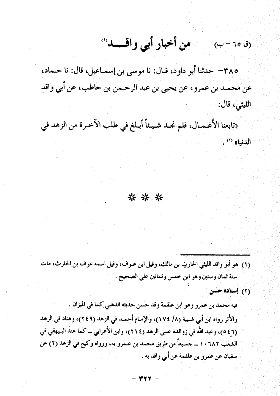 370 - حَدَّثَنَا أَبُو دَاوُدَ قَالَ: نا مُوسَى بْنُ إِسْمَاعِيلَ، قَالَ: نا حَمَّادٌ، عَنْ مُحَمَّدِ بْنِ عَمْرٍو، عَنْ يَحْيَى بْنِ عَبْدِ الرَّحْمَنِ بْنِ حَاطِبٍ، عَنْ أَبِي وَاقِدٍ اللَّيْثِيِّ، قَالَ: §تَابَعْنَا الْأَعْمَالَ، فَلَمْ نَجِدْ شَيْئًا أَبْلَغَ فِي طَلَبِ الْآخِرَةِ مِنَ الزُّهْدِ فِي الدُّنْيَا.