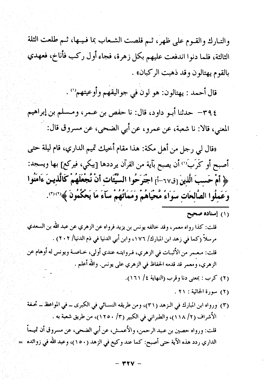 379 - حَدَّثَنَا أَبُو دَاوُدَ قَالَ: نا حَفْصُ بْنُ عُمَرَ، وَمُسْلِمُ بْنُ إِبْرَاهِيمَ الْمَعْنِيُّ قَالَا: نا شُعْبَةُ، عَنْ عَمْرٍو، عَنْ أَبِي الضُّحَى، عَنْ مَسْرُوقٍ، قَالَ: قَالَ لِي رَجُلٌ مِنْ أَهْلِ مَكَّةَ: §هَذَا مَقَامُ أَخِيكَ تَمِيمٍ الدَّارِيِّ، قَامَ لَيْلَةً حَتَّى أَصْبَحَ أَوْ كَرُبَ أَنْ يُصْبِحَ بِآيَةٍ مِنَ الْقُرْآنِ يُرَدِّدُهَا يَبْكِي، فَيَرْكَعُ بِهَا وَيَسْجُدُ: {أَمْ حَسِبَ الَّذِينَ اجْتَرَحُوا السَّيِّئَاتِ أَنْ نَجْعَلَهُمْ كَالَّذِينَ آمَنُوا وَعَمِلُوا الصَّالِحَاتِ سَوَاءً مَحْيَاهُمْ وَمَمَاتُهُمْ، سَاءَ مَا يَحْكُمُونَ} [الجاثية: 21] .