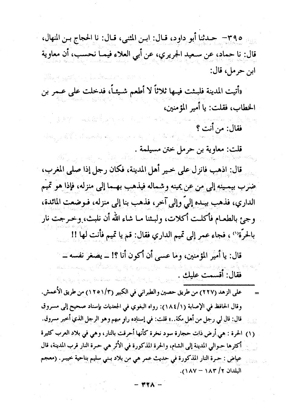 380 - حَدَّثَنَا أَبُو دَاوُدَ قَالَ: ابْنُ الْمُثَنَّى قَالَ: نا الْحَجَّاجُ بْنُ الْمِنْهَالِ، قَالَ: نا حَمَّادٌ، عَنْ سَعِيدٍ الْجُرَيْرِيِّ، عَنْ أَبِي الْعَلَاءِ، فِيمَا نَحْسِبُ، أَنَّ مُعَاوِيَةَ بْنَ حَرْمَلٍ، قَالَ: §أَتَيْتُ الْمَدِينَةَ فَلَبِثْتُ فِيهَا ثَلَاثًا لَا أَطْعَمُ شَيْئًا، فَدَخَلْتُ عَلَى عُمَرَ بْنِ الْخَطَّابِ، فَقُلْتُ: يَا أَمِيرَ الْمُؤْمِنِينَ، فَقَالَ: مَنْ أَنْتَ؟ قُلْتُ: مُعَاوِيَةُ بْنُ حَرْمَلٍ خَتَنُ مُسَيْلِمَةَ. قَالَ: اذْهَبْ فَانْزِلْ عَلَى خَيْرِ أَهْلِ الْمَدِينَةِ، فَكَانَ الرَّجُلُ إِذَا صَلَّى الْمَغْرِبَ، ضَرَبَ بِيَمِينِهِ إِلَى مَنْ عَنْ يَمِينِهِ وَشِمَالِهِ فَيَذْهَبُ بِهِمَا إِلَى مَنْزِلِهِ، فَإِذَا هُوَ تَمِيمٌ الدَّارِيُّ، فَذَهَبَ بِيَدِهِ إِلَيَّ وَإِلَى آخَرَ، فَذَهَبَ بِنَا إِلَى مَنْزِلِهِ، فَوُضِعَتِ الْمَائِدَةُ، وَجِيءَ بِالطَّعَامِ فَأَكَلْتُ أُكُلَاتٍ، وَلَبِثْنَا مَا شَاءَ اللَّهُ أَنْ نَلْبَثَ، وَخَرَجَتْ نَارٌ بِالْحَرَّةِ، فَجَاءَ عُمَرُ إِلَى تَمِيمٍ الدَّارِيِّ فَقَالَ: قُمْ يَا تَمِيمُ فَأَنْتَ لَهَا قَالَ: يَا أَمِيرَ الْمُؤْمِنِينَ، وَمَا عَسَى أَنْ أَكُونَ أَنَا؟ يُصَغِّرُ نَفْسَهُ فَقَالَ: أَقْسَمْتُ عَلَيْكَ. -[329]- فَقَامَ، وَتَبِعْتُهُمَا نَحْوَ النَّارِ، فَجَعَلَ تَمِيمٌ يَحُوشُهَا حَتَّى أَدْخَلَهَا الْغَارَ الَّذِي خَرَجَتْ مِنْهُ، ثُمَّ اقْتَحَمَ عَلَى أَثَرِهَا، ثُمَّ خَرَجَ، وَلَمْ تَضُرَّهُ شَيْئًا. فَقَالَ عُمَرُ: أَمَّا مَنْ شَهِدَ، كَمَنْ لَمْ يَشْهَدْ، وَمَا مَنْ رَأَى كَمَنْ لَمْ يَرَ.