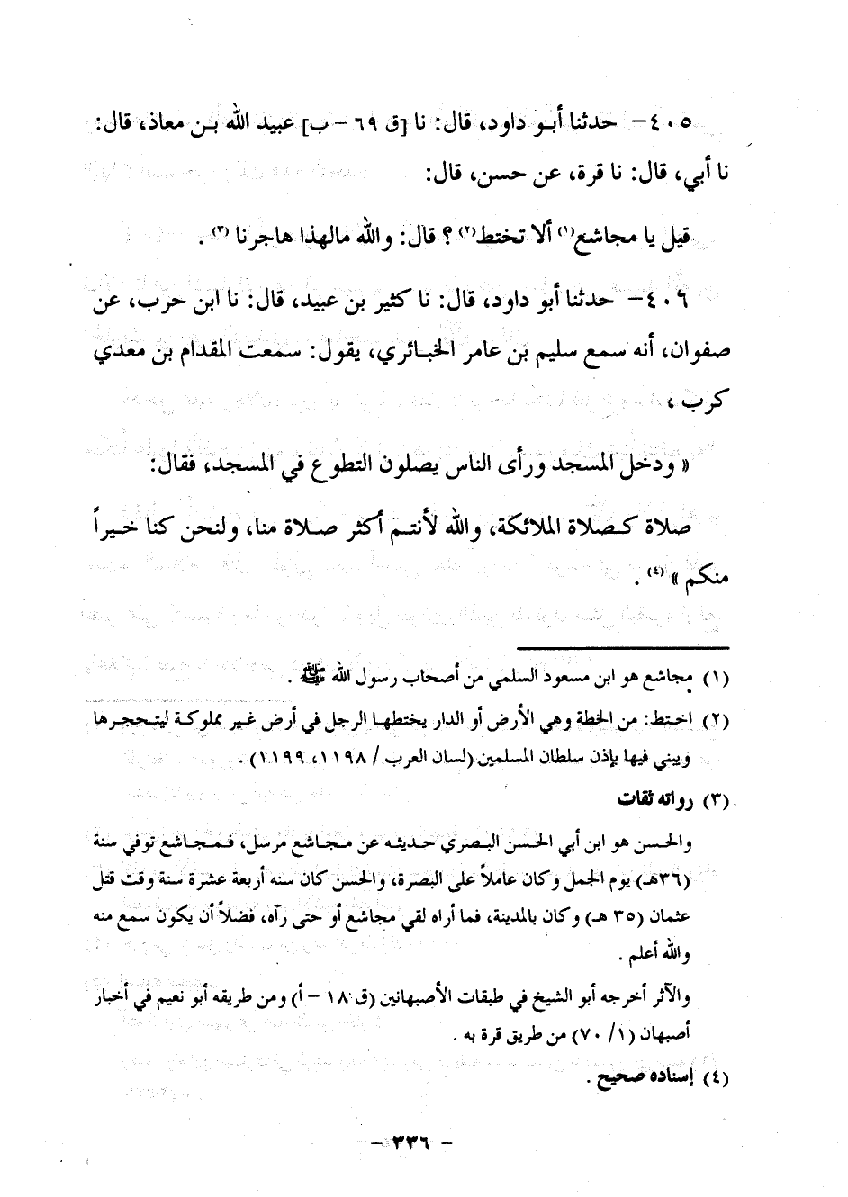 390 - حَدَّثَنَا أَبُو دَاوُدَ قَالَ: نا عُبَيْدُ اللَّهِ بْنُ مُعَاذٍ، قَالَ: نا أَبِي قَالَ: نا قُرَّةُ، عَنِ الْحَسَنِ، قَالَ: §قِيلَ يَا مُجَاشِعُ أَلَا تَخْتَطُّ؟ قَالَ: وَاللَّهِ مَا لِهَذَا هَاجَرْنَا.