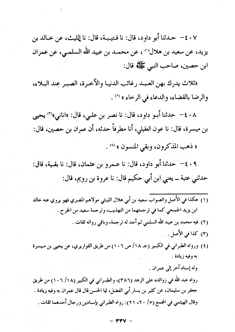 392 - حَدَّثَنَا أَبُو دَاوُدَ قَالَ: نا قُتَيْبَةُ، قَالَ: نا اللَّيْثُ، عَنْ خَالِدِ بْنِ يَزِيدَ، عَنْ سَعِيدِ بْنِ هِلَالٍ، عَنْ مُحَمَّدِ بْنِ عُبَيْدِ اللَّهِ السُّلَمِيِّ، عَنْ عِمْرَانَ بْنِ حُصَيْنٍ، صَاحِبِ النَّبِيِّ صَلَّى اللَّهُ عَلَيْهِ وَسَلَّمَ قَالَ: §ثَلَاثٌ يُدْرِكُ بِهِنَّ الْعَبْدُ رَغَائِبَ الدُّنْيَا وَالْآخِرَةِ، الصَّبْرُ عند الْبَلَاءِ، وَالرِّضَا بِالْقَضَاءِ، وَالدُّعَاءُ فِي الرَّخَاءِ.