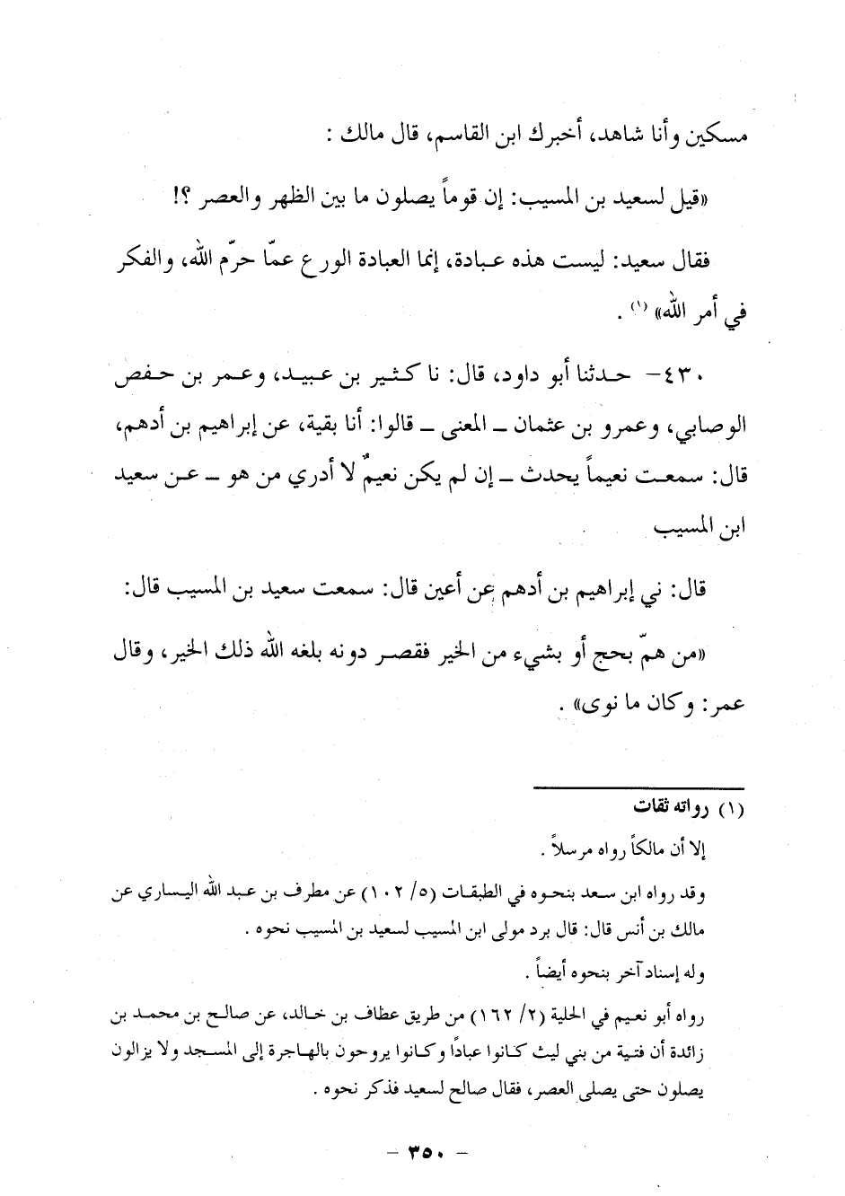 415 - حَدَّثَنَا أَبُو دَاوُدَ قَالَ: نا كَثِيرُ بْنُ عُبَيْدٍ، وَعُمَرُ بْنُ حَفْصٍ الْوَصَّابِيُّ، وَعَمْرُو بْنُ عُثْمَانَ الْمَعْنِيُّ، قَالُوا: أنا بَقِيَّةُ، عَنْ إِبْرَاهِيمَ بْنِ أَدْهَمَ، قَالَ: سَمِعْتُ نَعِيمًا، يُحَدِّثُ إِنْ لَمْ يَكُنْ نُعَيْمٌ لَا أَدْرِي مَنْ هُوَ؟ عَنْ سَعِيدِ بْنِ الْمُسَيِّبِ. قَالَ: ني إِبْرَاهِيمُ بْنُ أَدْهَمَ عَنْ أَعْيَنَ قَالَ: سَمِعْتُ سَعِيدَ بْنَ الْمُسَيِّبِ قَالَ: §مَنْ هَمَّ بِحَجٍّ أَوْ بِشَيْءٍ مِنَ الْخَيْرِ فَقَصَرَ دُونَهُ بَلَّغَهُ اللَّهُ ذَلِكَ الْخَيْرَ، وَقَالَ عُمَرُ: وَكَانَ مَا نَوَى.