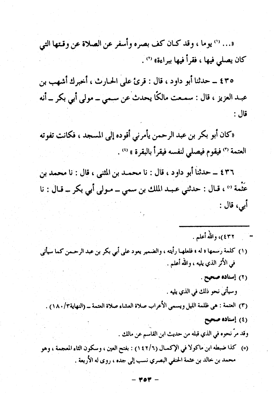420 - حَدَّثَنَا أَبُو دَاوُدَ قَالَ: قُرِئَ عَلَى الْحَارِثِ، أَخْبَرَكَ أَشْهَبُ بْنُ عَبْدِ الْعَزِيزِ، قَالَ: سَمِعْتُ مَالِكًا، يُحَدِّثُ عَنْ سُمَيٍّ مَوْلَى أَبِي بَكْرٍ أَنَّهُ قَالَ: §كَانَ أَبُو بَكْرِ بْنُ عَبْدِ الرَّحْمَنِ يَأْمُرُنِي أَقُودُهُ إِلَى الْمَسْجِدِ، فَكَانَتْ تَفُوتُهُ الْعَتَمَةُ فَيَقُومُ فَيُصَلِّي لِنَفْسِهِ فَيَقْرَأُ بِالْبَقَرَةِ.
